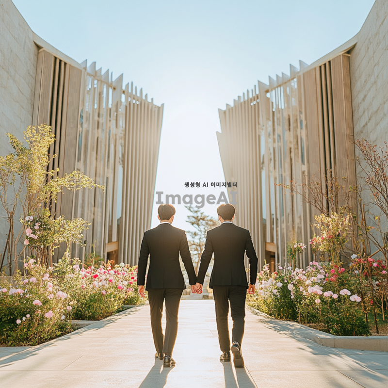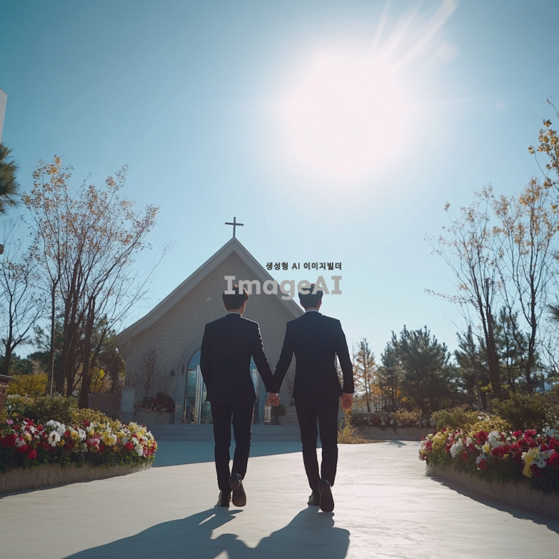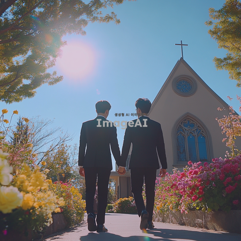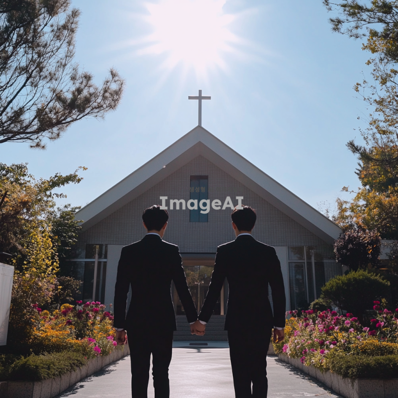 중심에는 한국인 남성 두 명이 있습니다. 두 사람은 블랙 색상의 결혼식 의상을 입고 있으며, 서로의 손을 잡고 교회안으로 걸어 들어가고 있습니다.