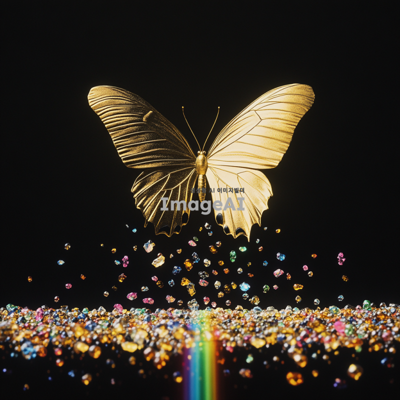 검정 배경에 무지개빛이 퍼져 있는 장면, 중앙에는 황금색 아주 큰 나비가 정면으로 날고 있는 모습, 나비 아래에는 알록달록한 보석들이 흩어져 있는 이미지.