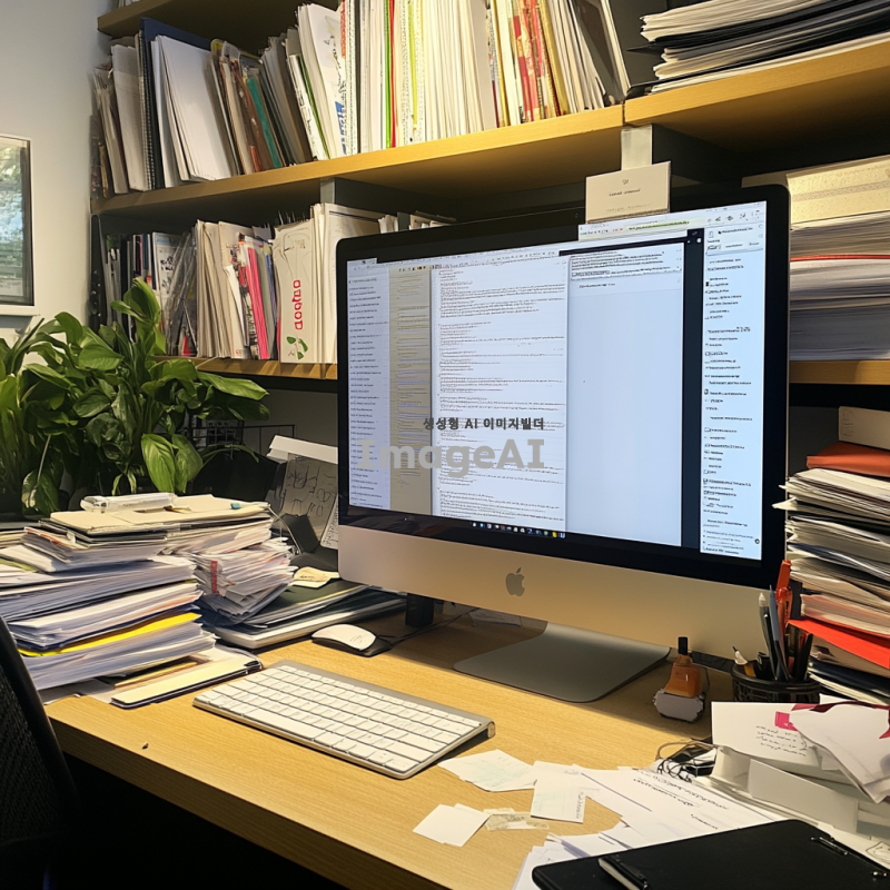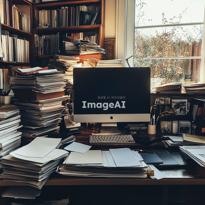 인스타그램 스토리 화면인데 스토리 사진은 컴퓨터 주위에 서류가 가득 쌓인 자리에 앉아서 1인칭으로 찍은 사진이면 좋겠어. 계정 이름은 마음대로 해도 돼.