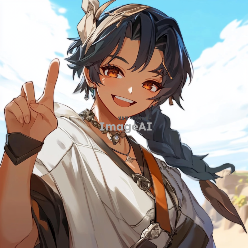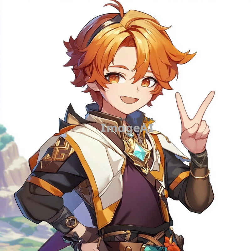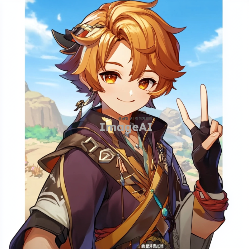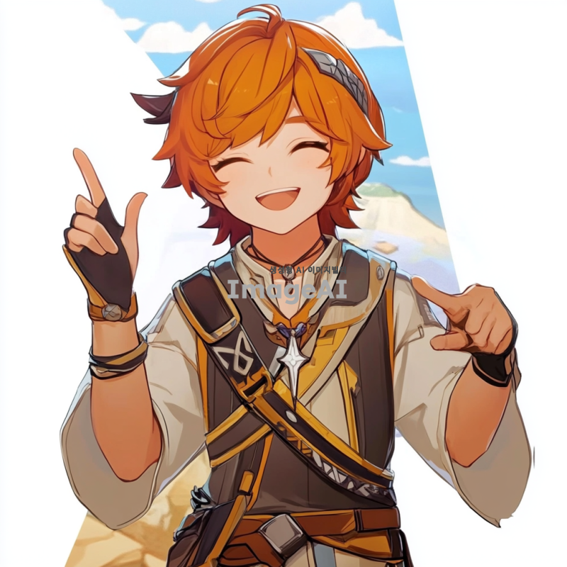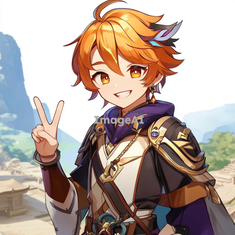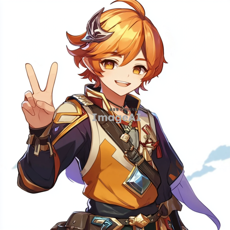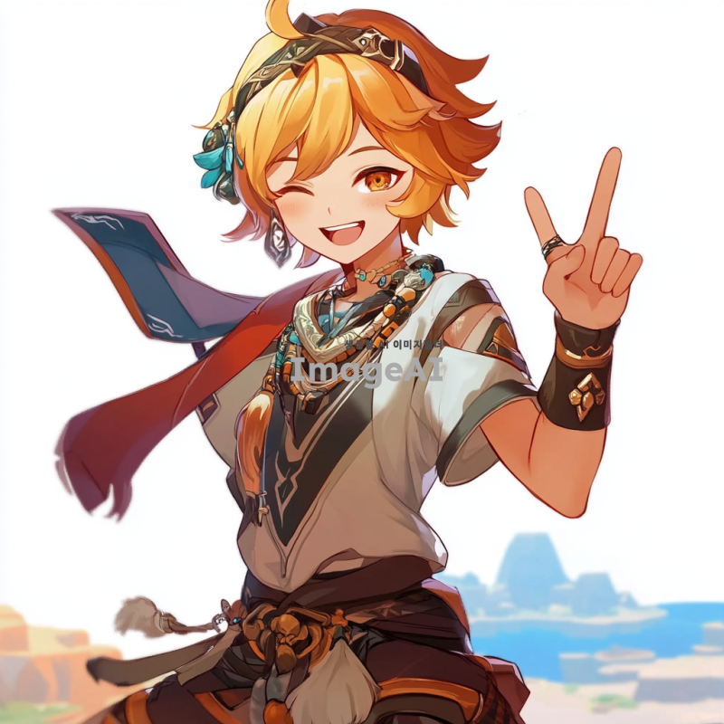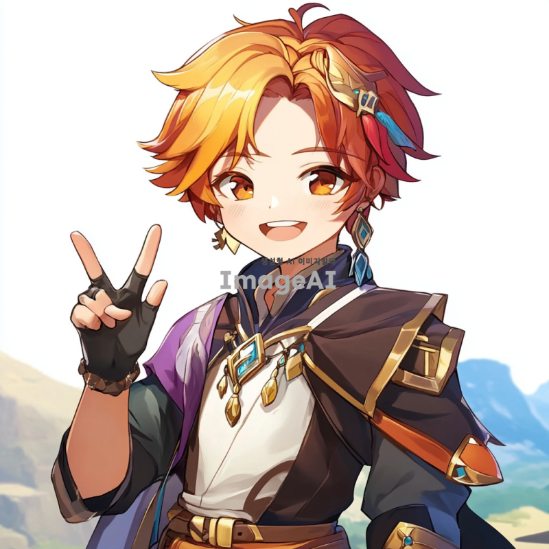 원신의 스발란케 캐릭터를 중심으로 한 일러스트, 배경은 아무것도 없이 하얗게, 유쾌하고 털털한 성격이라 웃으면서 브이를 하고 있는 포즈.