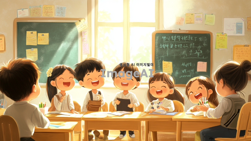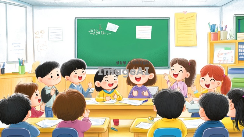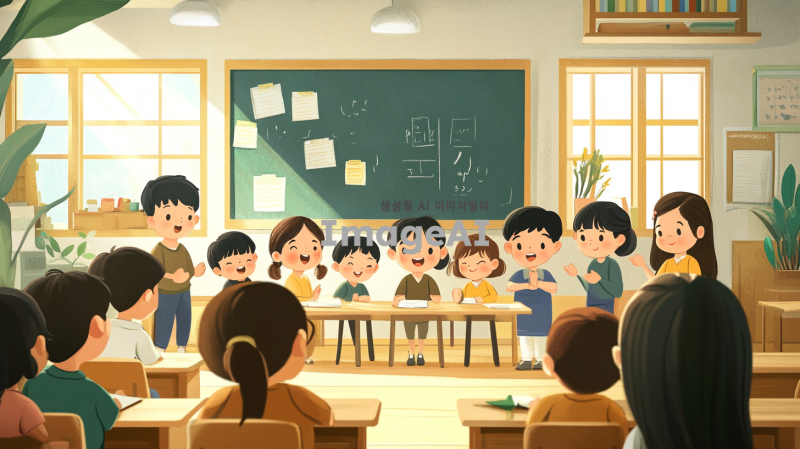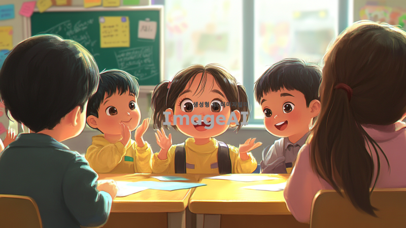 아이들이 교실에 모여 앉아 활발하게 토론하고 있는 모습, 다양한 인종과 성별의 한국 어린이들, 밝은 교실 환경, 칠판과 책상이 있는 배경, 서로의 의견을 나누며 웃고 있는 모습, 활기차고 즐거운 학습 분위기.