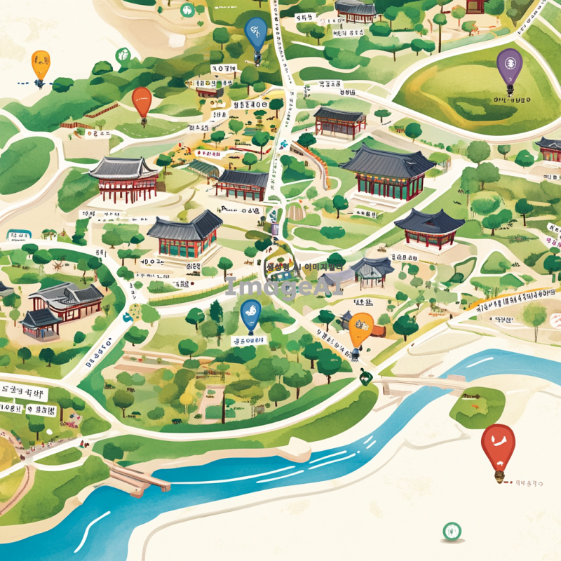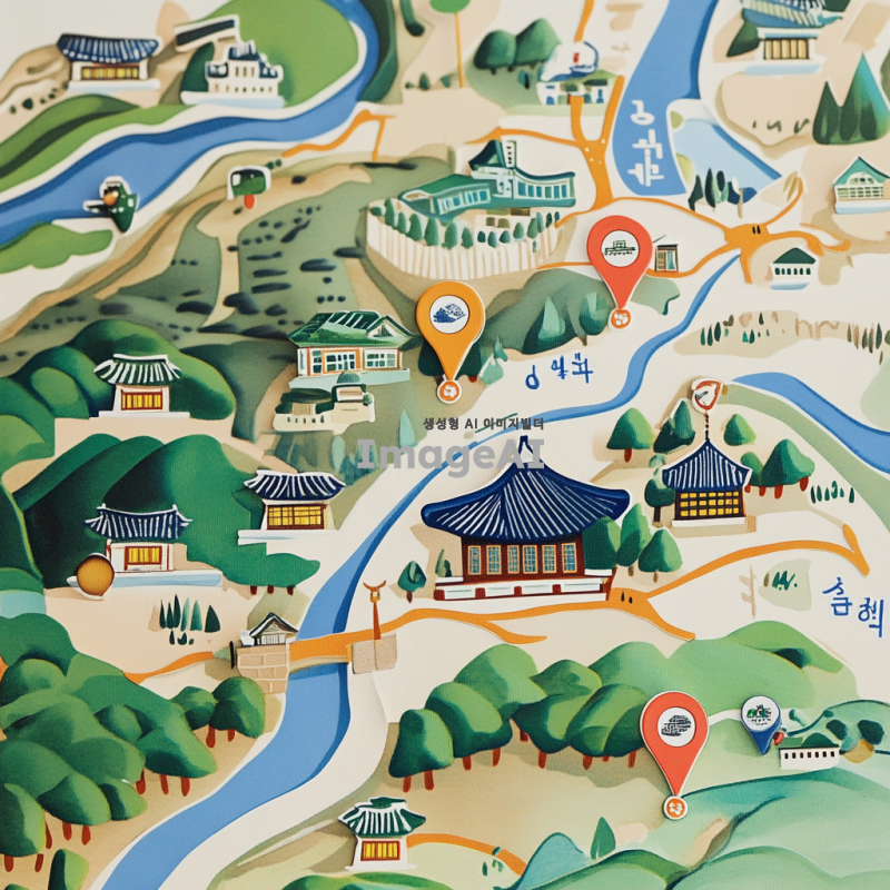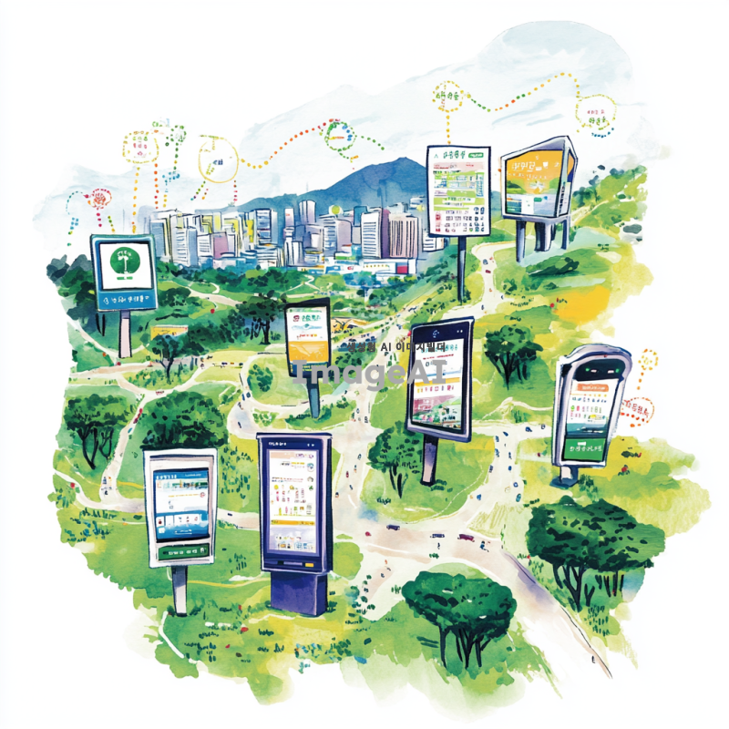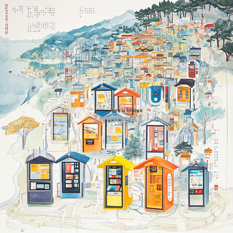 대한민국 지도 위에 다양한 색상으로 표시된 키오스크의 위치 좌표가 나타난 그림. 지도는 세밀하게 그려져 있으며, 키오스크는 현대적인 디자인으로 표현되고, 주변에 도시 풍경과 자연 경관이 조화롭게 어우러진 모습. 각 키오스크 위치에는 명확한 좌표가 적혀 있어 쉽게 알아볼 수 있도록 구성.