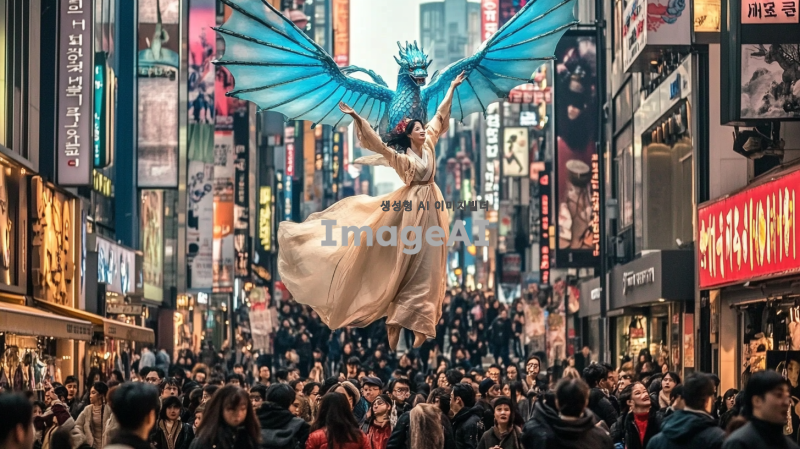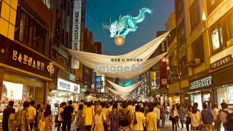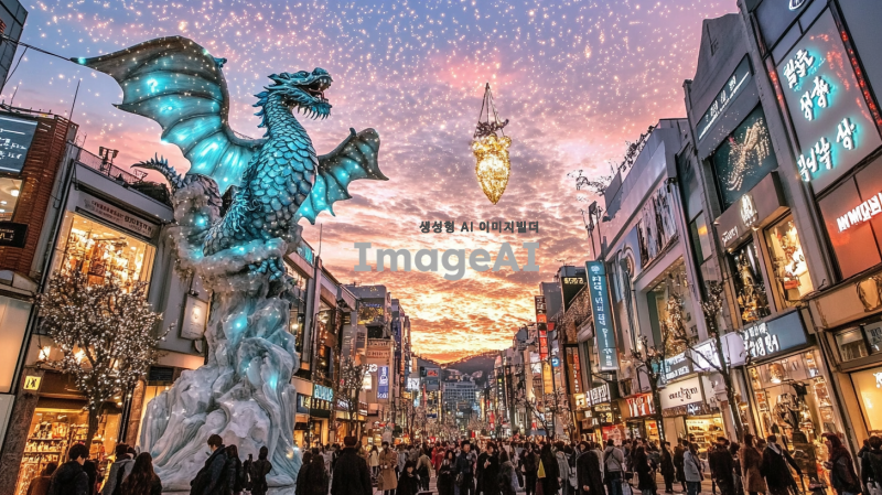 명동거리의 화려한 야경을 배경으로 하늘에 청룡이 여의주를 물고 있는 장면, 청룡의 비늘은 빛나는 푸른색으로 표현되며, 여의주는 황금빛으로 빛나고 있다. 주변에는 사람들과 상점들이 가득하고, 하늘은 저녁 노을로 물들어 있다. 청룡의 위엄 있는 모습과 함께 명동의 활기찬 분위기가 잘 어우러져 있다.