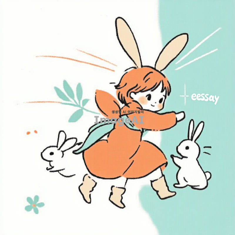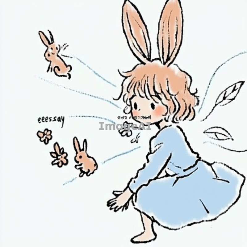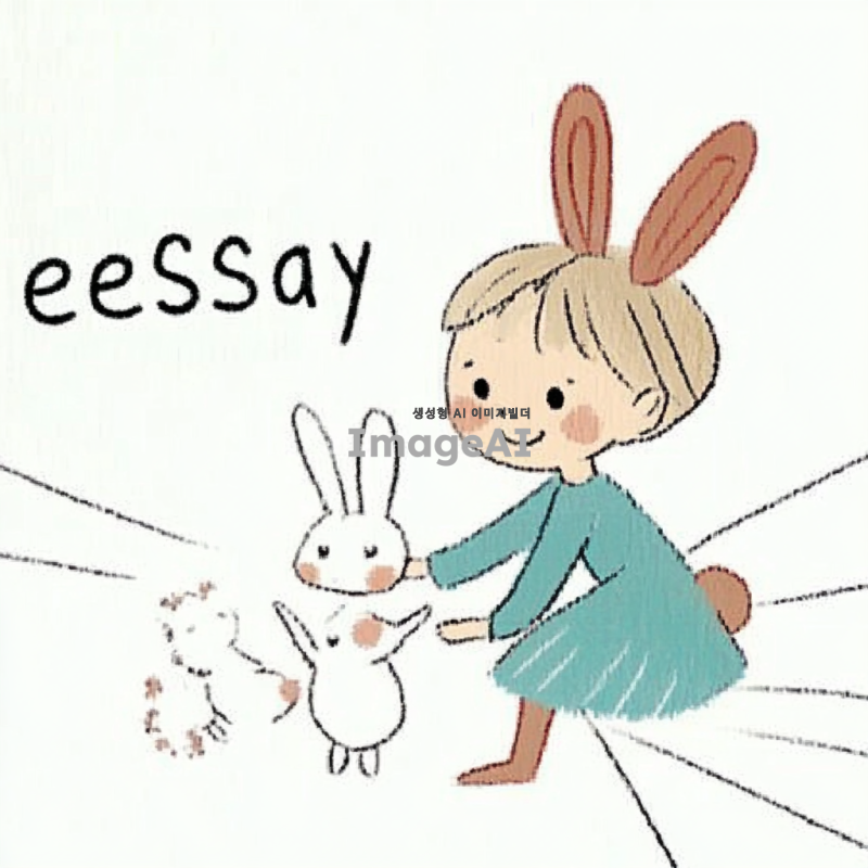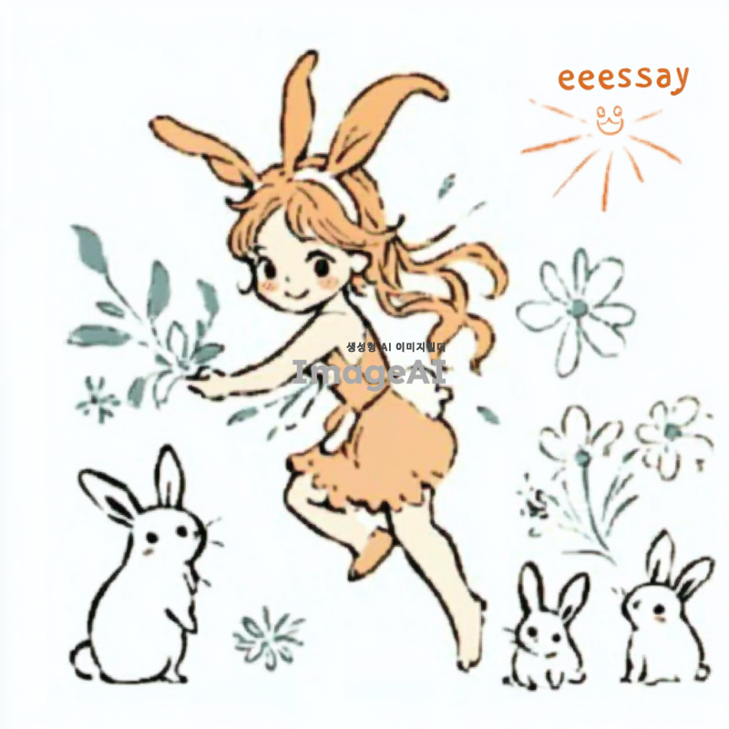 사랑스럽고 소녀스러운 분위기의 엽서 디자인, 화사한 pastel 색상 배경, 귀여운 꽃과 리본 장식, 브랜드 로고 "eessay"가 돋보이게 배치, 한국 소녀가 사랑스럽고 경쾌한 포즈로 서 있는 모습, 주변에 작은 토끼와 함께, 전체적으로 따뜻하고 아기자기한 느낌을 주는 일러스트 스타일.