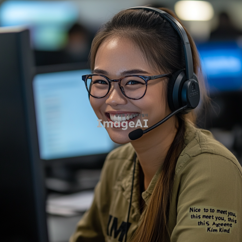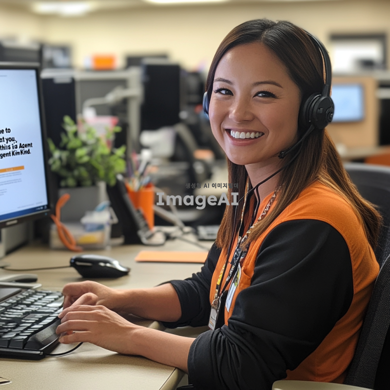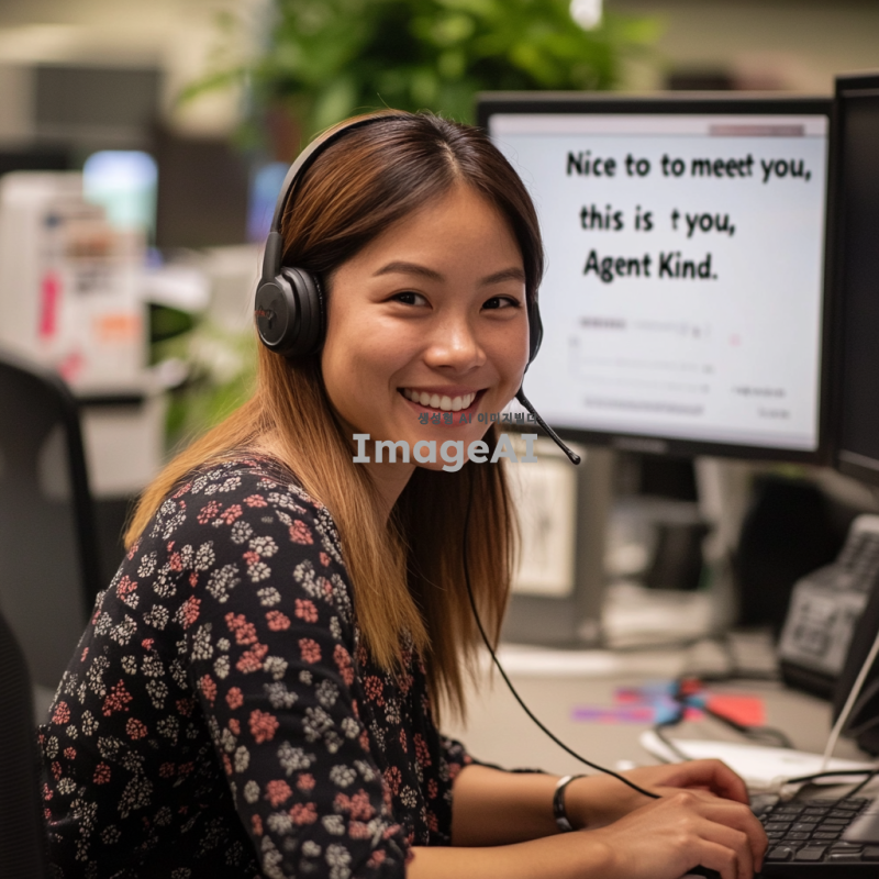 콜센터 여자 상담사가 고객의 전화를 받는 모습이고요 맞이인사말은 '반갑습니다 상담사 김친절입니다'라고 하고요 얼굴 표정은 환하게 웃고 있어요