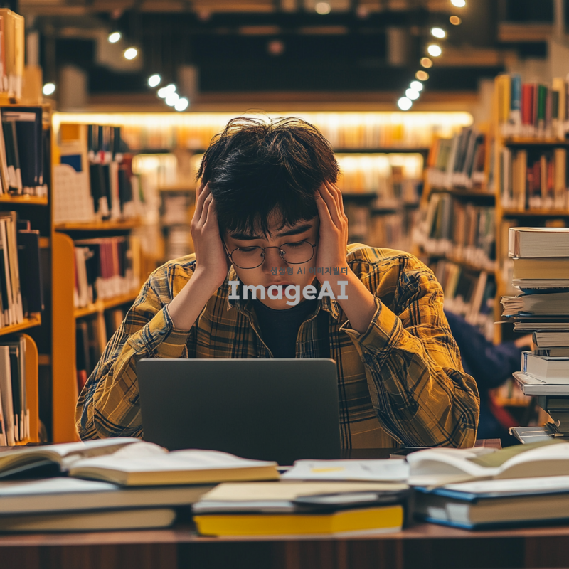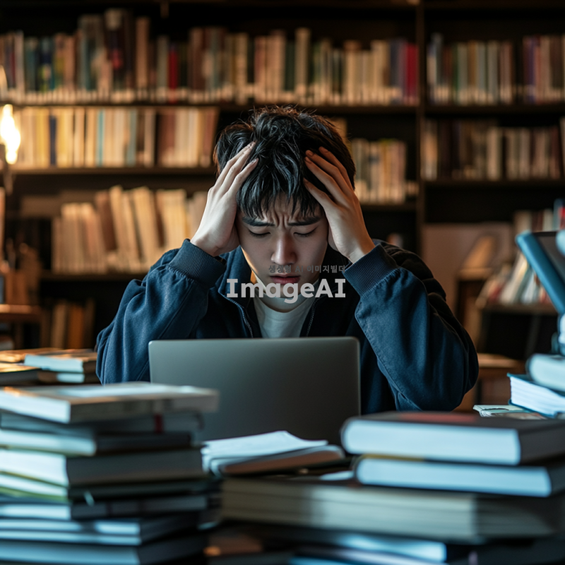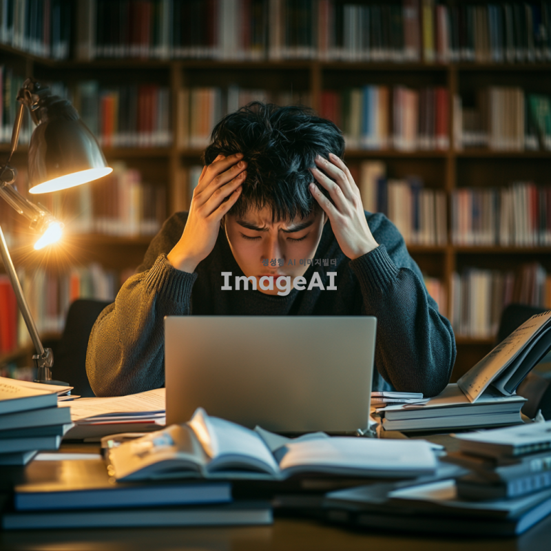 대학 도서관에서 책과 노트북에 둘러싸인 한국인 대학생, 스트레스를 받으며 머리를 감싸고 있는 모습, 눈에 피로가 가득하고 주변은 어지럽혀진 자료들로 가득, 어두운 조명 아래에서 집중하려고 애쓰는 모습, 긴장감이 흐르는 배경, 현대적인 대학 환경.