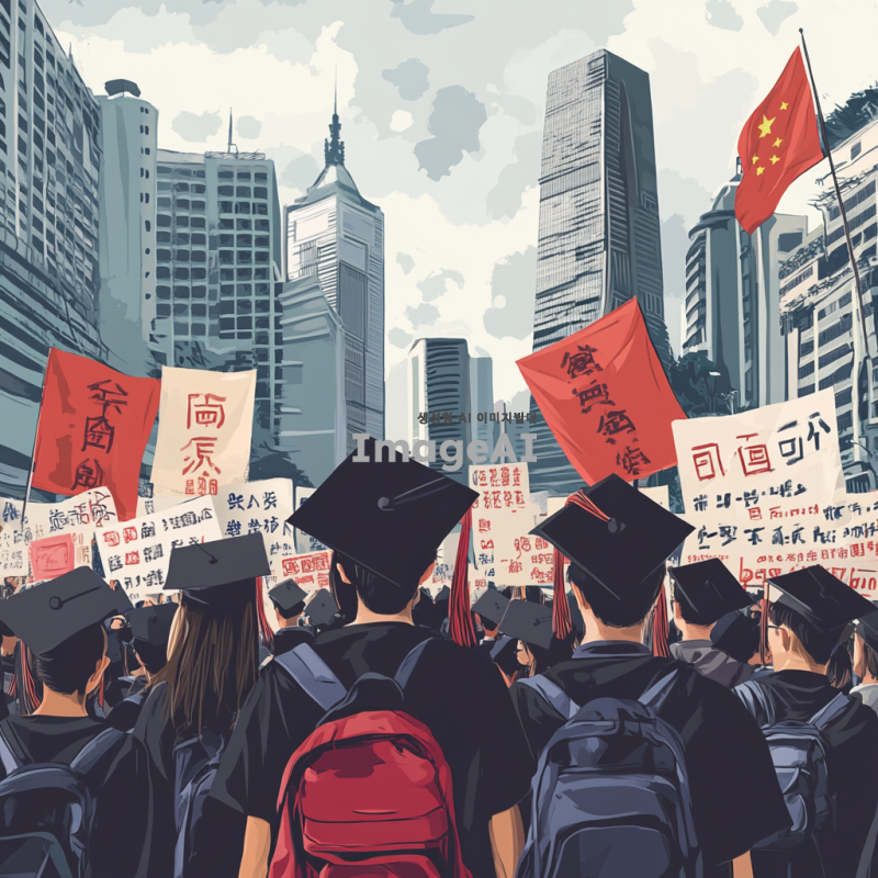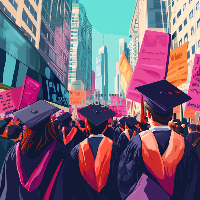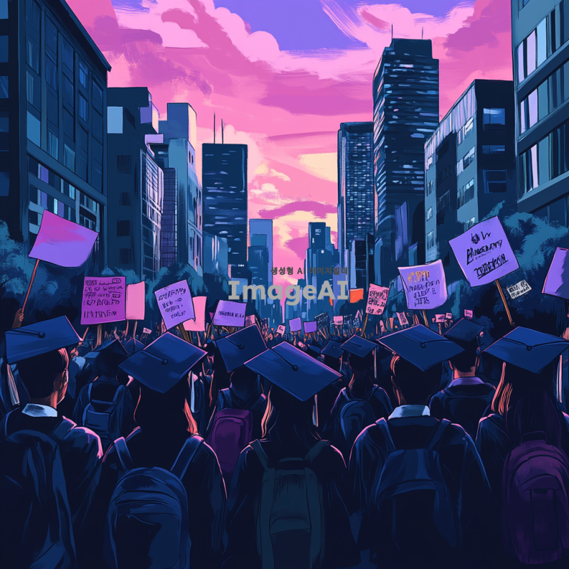 거대한 사회 앞에서 친구들과 함께 맞서 싸우는 대학 졸업 예정자들, 다양한 감정이 담긴 표정, 단체로 모여 결의를 다지는 모습, 배경에는 도시의 고층 건물과 시위 배너, 청춘의 열정과 연대감을 강조, 화려한 색감과 역동적인 구도