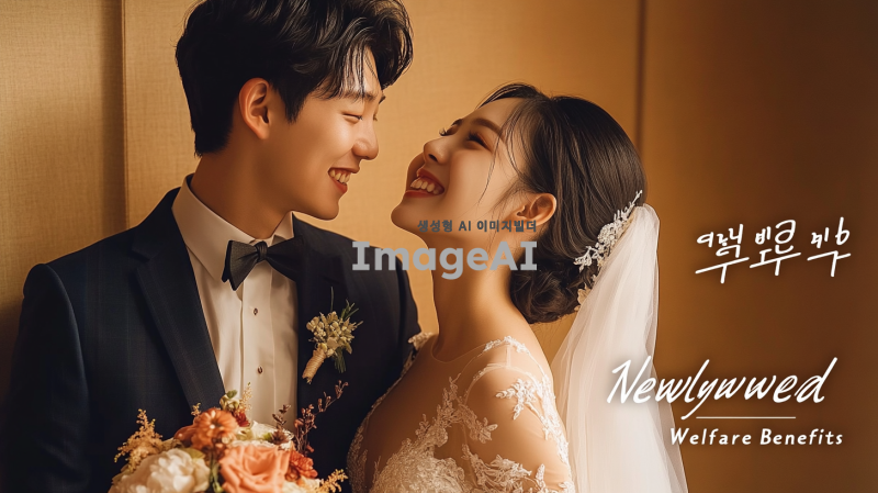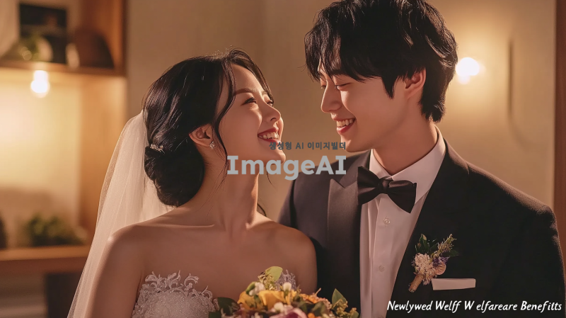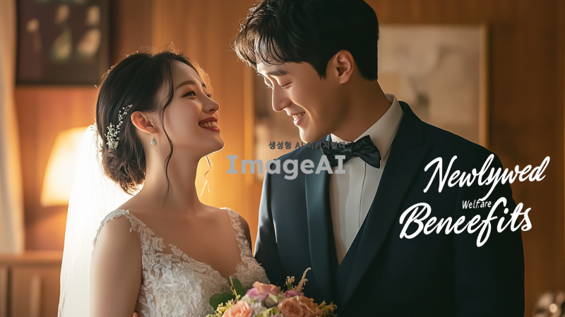 신혼부부 복지혜택 안내글의 타이틀 이미지, 부드러운 조명 아래 사랑스러운 한국인 신혼부부가 웃으며 서로를 바라보는 모습, 화사한 꽃다발과 함께 웨딩드레스와 턱시도를 입고 있는 모습, 배경에는 따뜻한 색감의 아늑한 실내 공간, 감성적인 분위기와 함께 "신혼부부 복지혜택"이라는 글씨가 부드럽게 어우러지는 디자인.