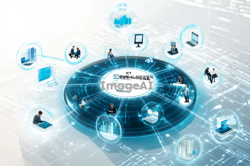 중앙에 큰 원형 허브가 위치하고, 이 허브에서 7개의 가지가 뻗어나가는 구조를 상상해보세요. 허브는 "ICT 커뮤니티/뉴스 플랫폼"을 상징합니다. 각 가지는 다음과 같은 플랫폼의 주요 기능을 나타냅니다: