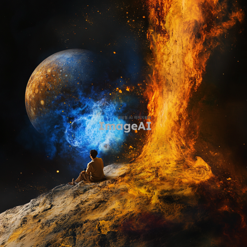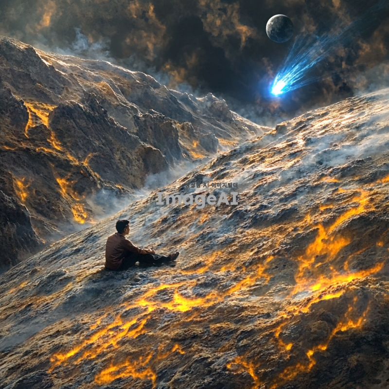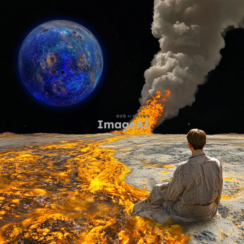 목성이 푸른 빛을 발하며 배경에 자리잡고 있고, 그 옆에는 가니메데의 표면이 보이는 장면. 화산 폭발이 자주 일어나는 이오의 표면에 앉아 있는 한국인 남성의 모습. 화산이 분출하며 연기와 용암이 하늘로 솟구치고, 주변은 황색과 주황색의 화산재로 덮여 있는 풍경. 남성은 편안한 자세로 앉아 있으며, 신비로운 우주를 바라보는 표정을 짓고 있다.