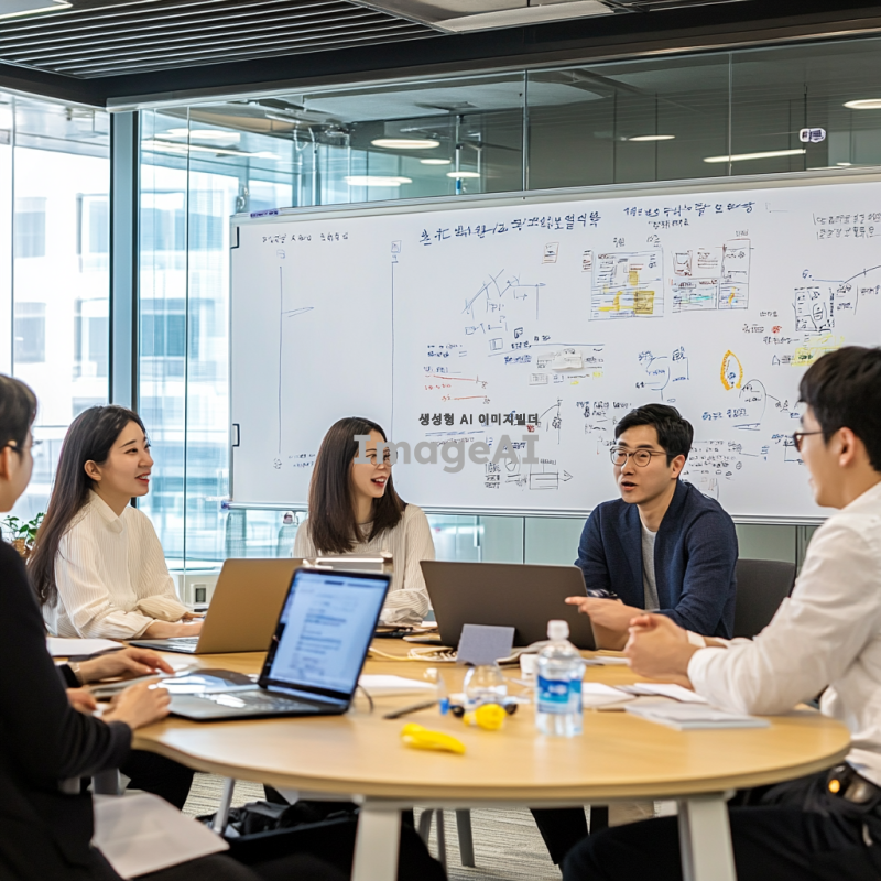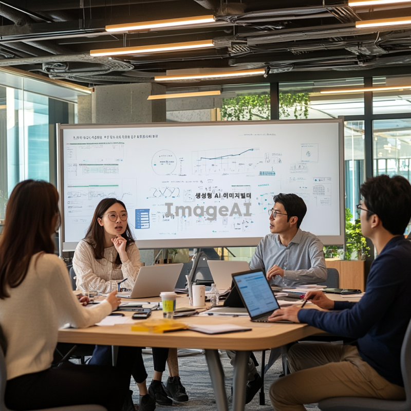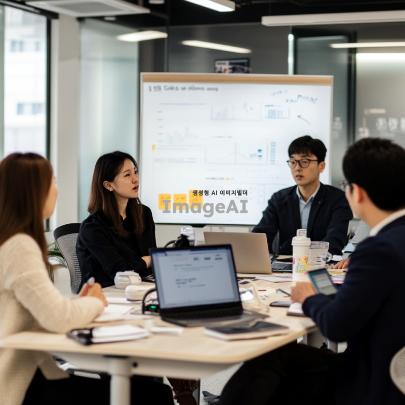비즈니스 분석을 위한 다양한 관점의 전문가들이 모여 있는 회의실. 밀착 멘토가 한국인 남성으로, 내부 전문가가 한국인 여성으로, 외부 전문가가 한국인 남성으로, 스타트업 대표가 한국인 여성으로 각각 앉아 있다. 각자의 노트북과 자료를 앞에 두고 열띤 토론을 벌이고 있으며, 화이트보드에는 다양한 비즈니스 모델과 전략이 적혀 있다. 회의실은 현대적이고 세련된 디자인으로, 창문을 통해 자연광이 들어오고 있다.