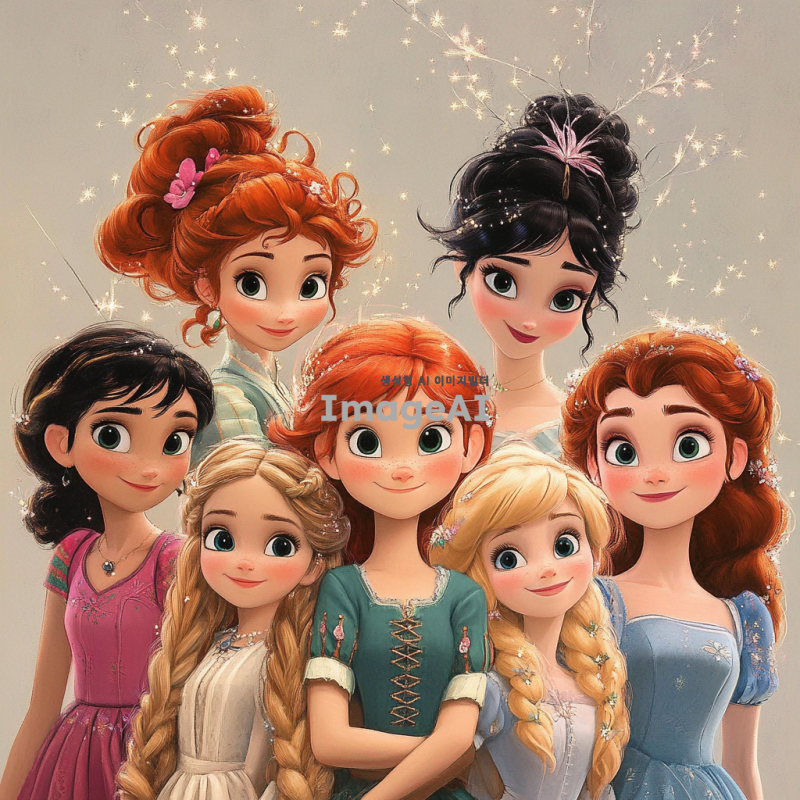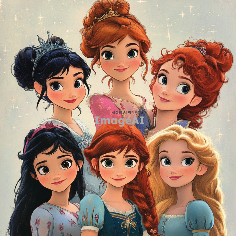 디즈니 캐릭터 바넬로피, 안나, 메리다, 오로라, 에리얼, 신데렐라, 벨, 총 7명이 함께 있는 그림