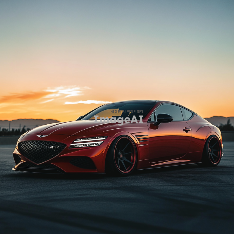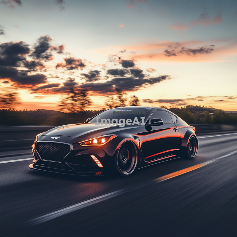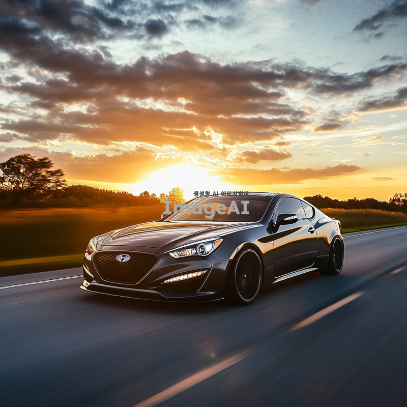 튜닝이 된 제네시스 쿠페, 세련된 외관과 강력한 엔진, 스포티한 디자인, 고급스러운 내부 인테리어, 도로 위에서 역동적으로 주행하는 모습, 현대적인 배경, 저녁 노을 아래에서 빛나는 차체, 세밀한 디테일과 함께 역동적인 감정 표현.