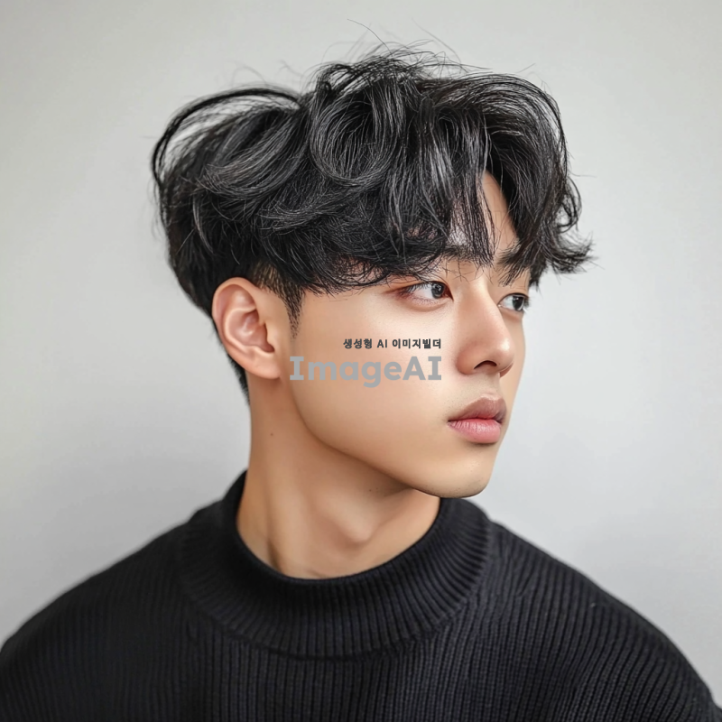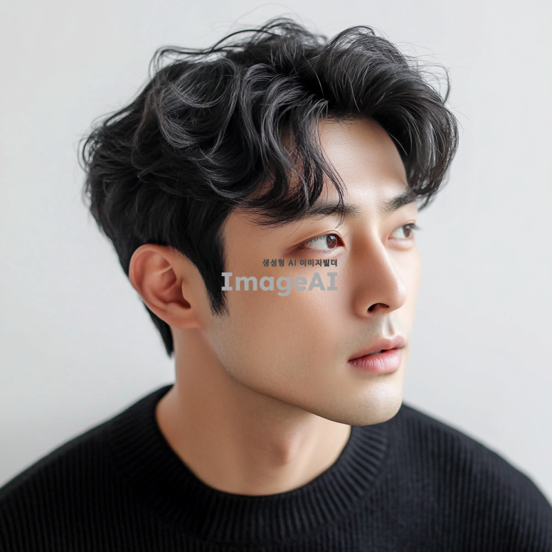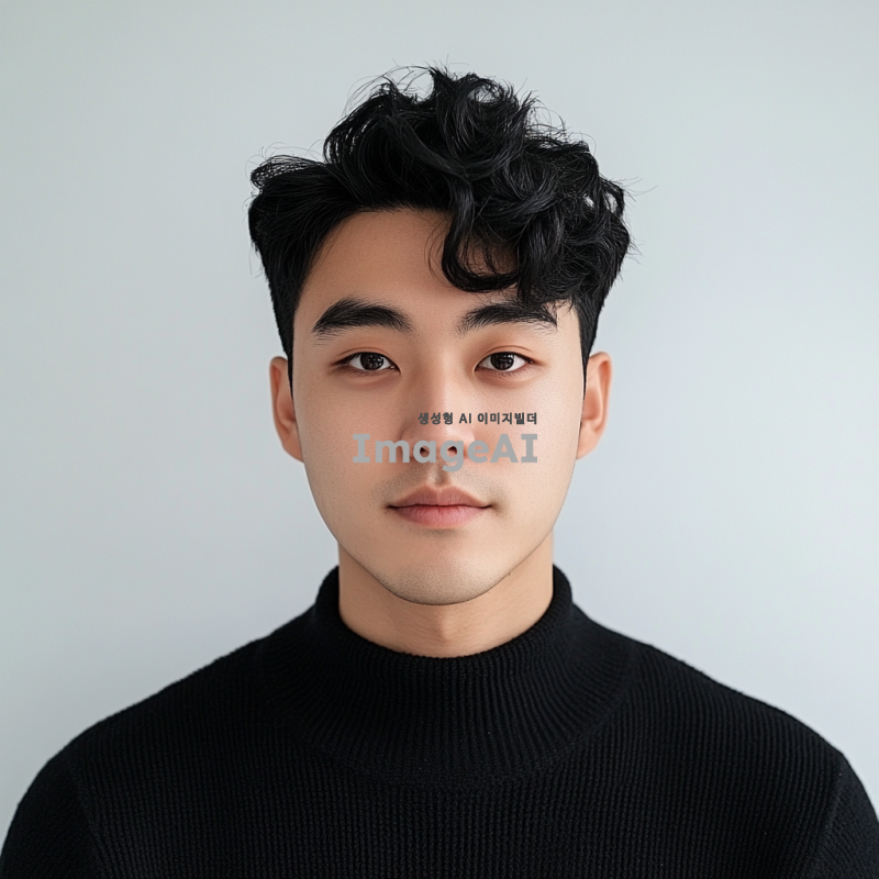 평범한 한국 남자, 검은 머리를 옆으로 가르마를 타고 웨이브 질감의 짧은 헤어스타일로 하고 있습니다. 그는 오버사이즈 검정 스웨터를 입고 있습니다. 배경 색상은 그의 프로필을 강조하기 위해 흰색 이어야 합니다. 자연스러운 피부 톤을 유지하고 정면을 바라보며 자신감 있는 모습으로 보이도록 하세요. 사진은 고화질로 보이도록 하고, 사진속 인물이 실제 같이 보이도록 하세요.