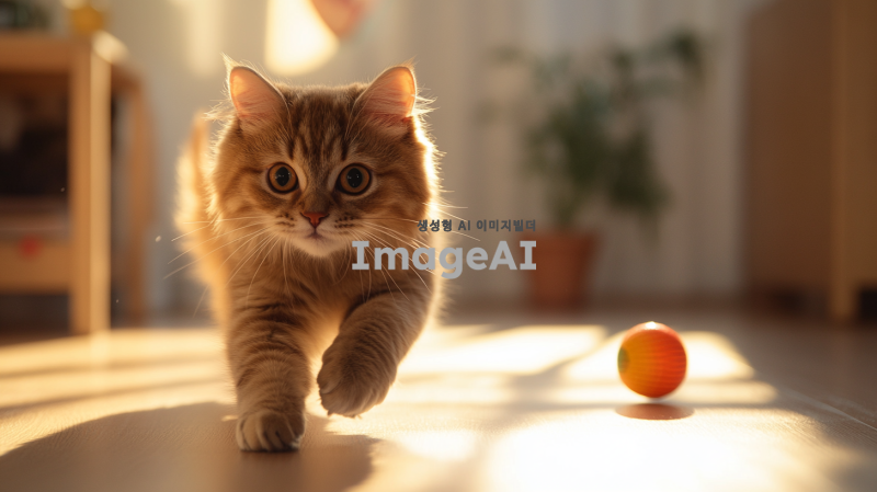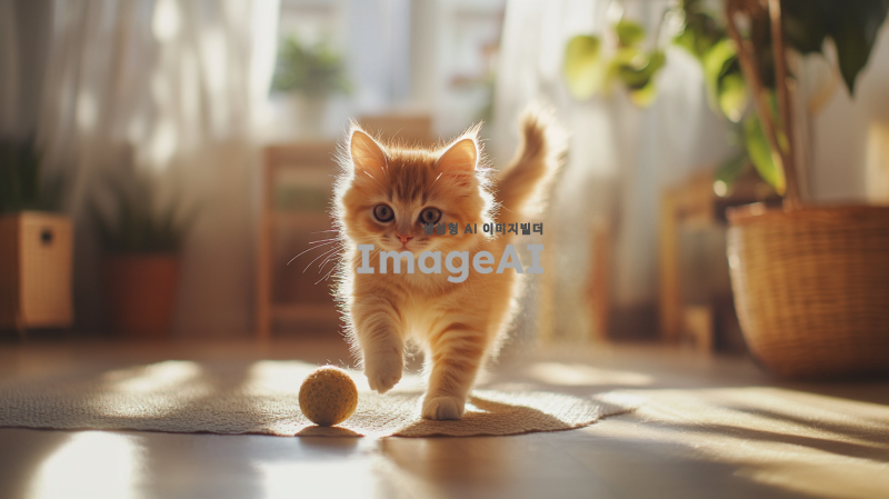 귀여운 고양이가 햇살 가득한 방 안에서 놀고 있는 모습, 부드러운 털과 큰 눈, 장난감 공을 가지고 뛰어다니는 모습, 배경에는 아기자기한 인테리어 소품들이 있는 따뜻한 분위기, 16:9 비율