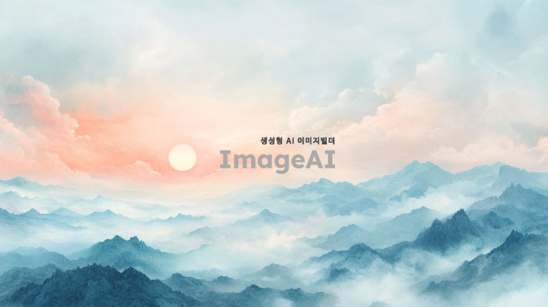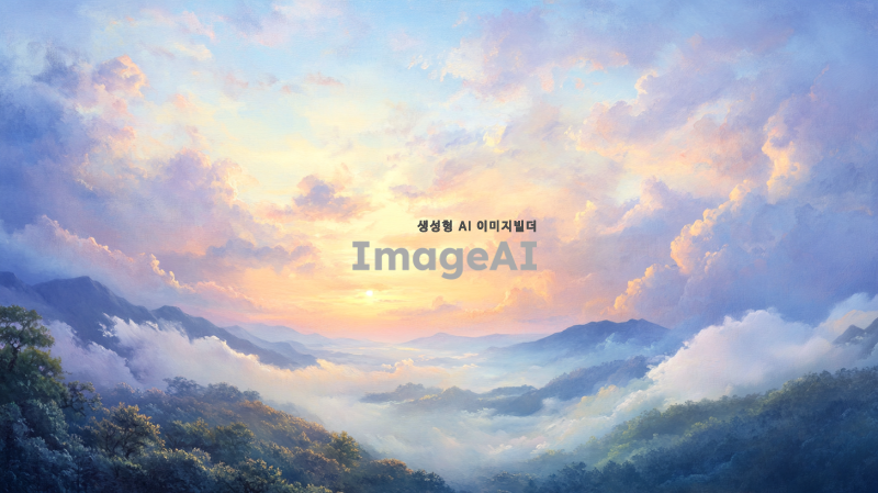 새벽 하늘의 아름다움을 담은 그림, 부드러운 파스텔 색조의 구름이 펼쳐진 하늘, 태양이 수평선에서 떠오르는 장면, 조용한 자연의 분위기, 한국의 전통적인 경치와 어우러진 풍경, 16:9 비율
