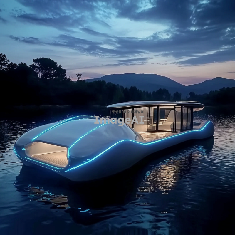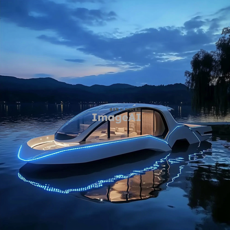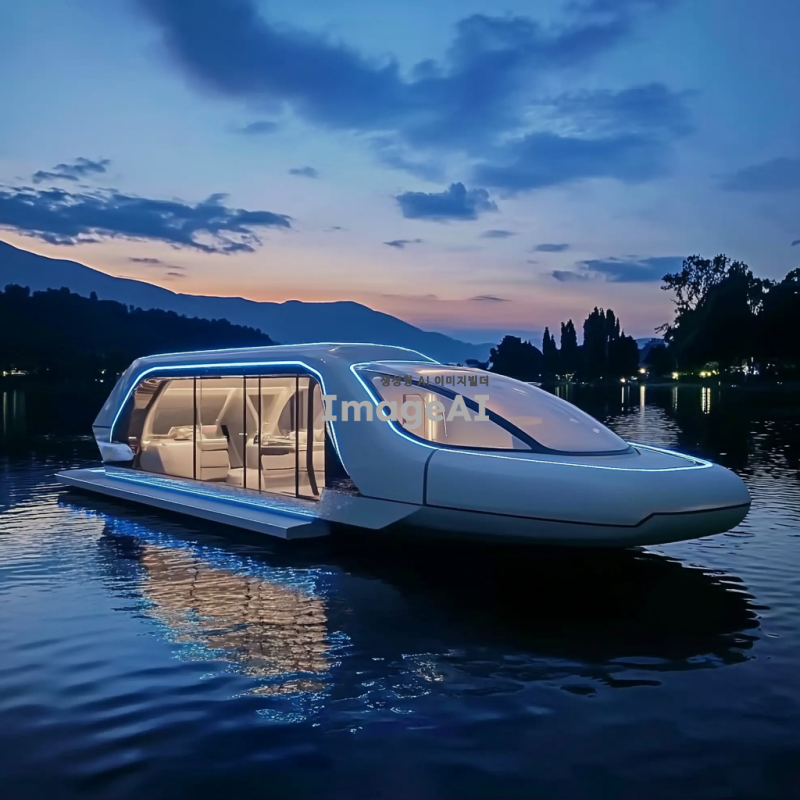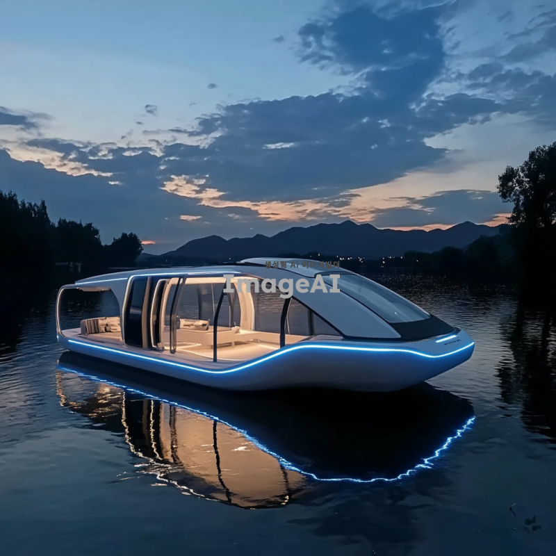 미래적이고 세련된 하이테크 전기 보트로, 파란 LED 조명이 있으며, 흰색 지붕과 어두운 회색 바디 색상 조합을 가지고 있습니다. 석양에 물 위에 주차되어 있습니다. 장면에는 하늘을 배경으로 실루엣으로 보이는 먼 산들이 포함되어 있어 고요하고 세련된 분위기를 만들어냅니다. 포토리얼리스틱 렌더링으로, 주변 조명 아래 호수 표면의 반사를 강조합니다.