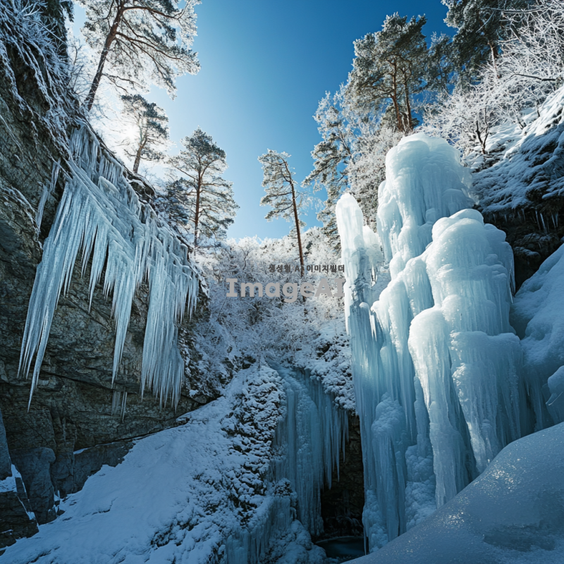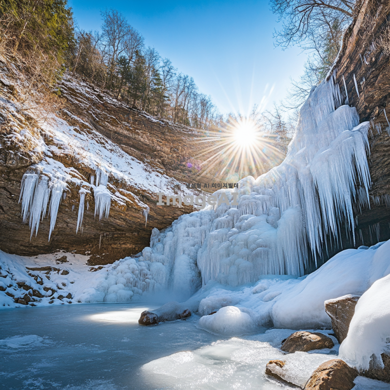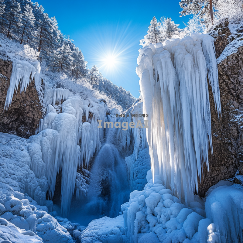 계곡의 폭포수가 얼어붙어 다양한 형태의 얼음 꽃송이가 피어 있는 장면, 맑고 푸른 하늘 아래 눈부신 햇살이 얼음 꽃송이에 반사되어 빛나는 모습, 주변의 나무와 바위들이 얼음으로 덮여 있는 겨울 풍경, 차가운 공기 속에서 신비로운 아름다움이 느껴지는 자연의 모습.