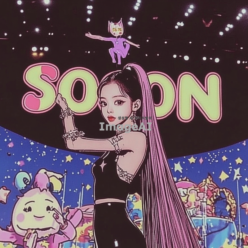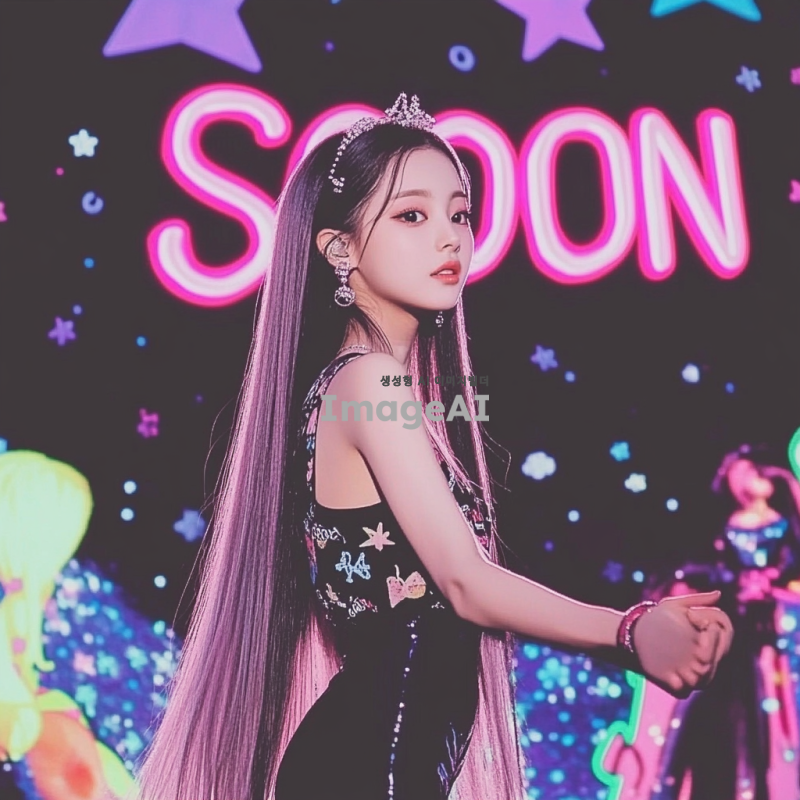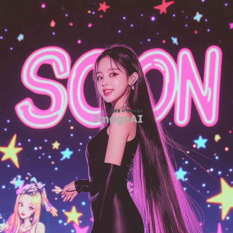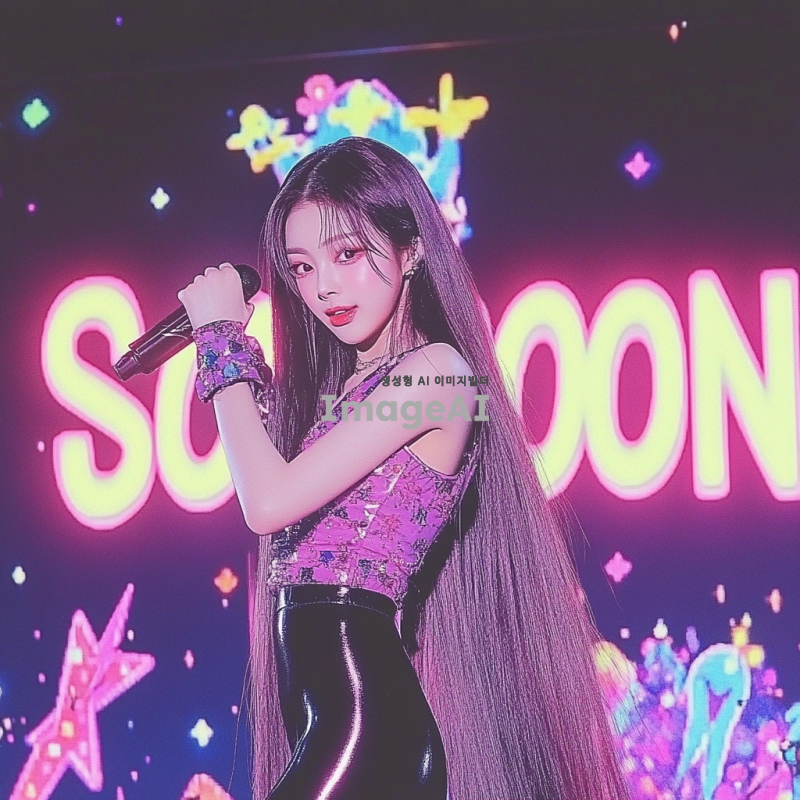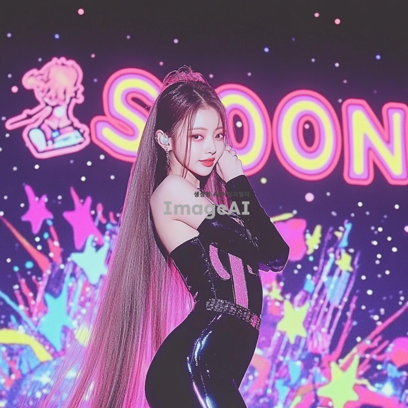 긴 생머리를 가진 한국 여자아이돌이 검정색 전신 타이즈를 입고 화려한 무대에서 춤추고 있는 모습. 배경에는 SOON 모양의 네온 무대 조명이 반짝이고, 귀여운 얼굴이 돋보이는 장면.