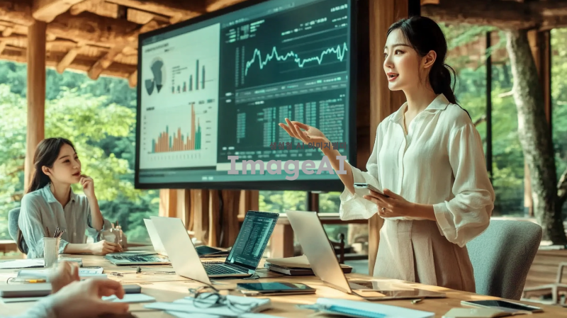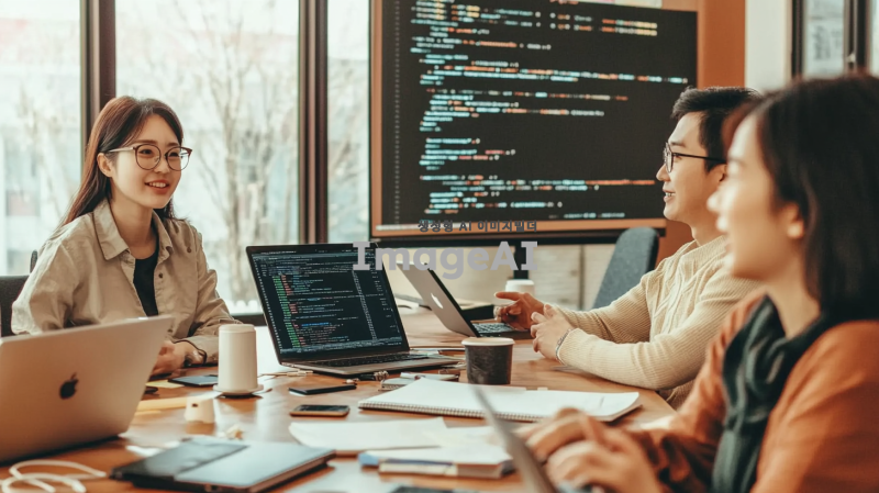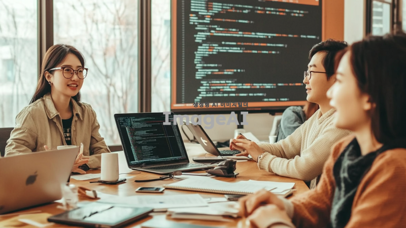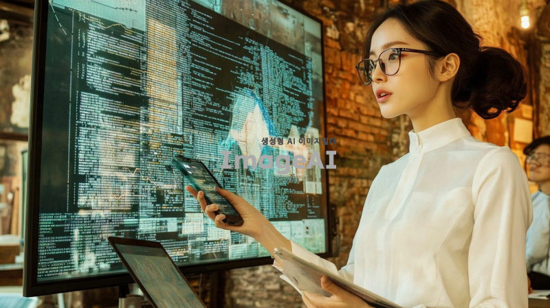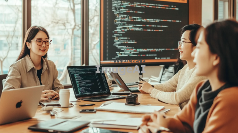 한국의 IT 전문가가 최신 기술 동향에 대해 토론하는 모습, 현대적인 사무실 환경에서 다양한 디지털 기기와 함께 앉아 있는 모습, 배경에는 대형 스크린에 데이터 분석 그래프와 코드가 표시되어 있음, 집중하는 표정으로 서로 의견을 나누는 모습, 세련된 복장과 함께 전문적인 분위기 강조.
