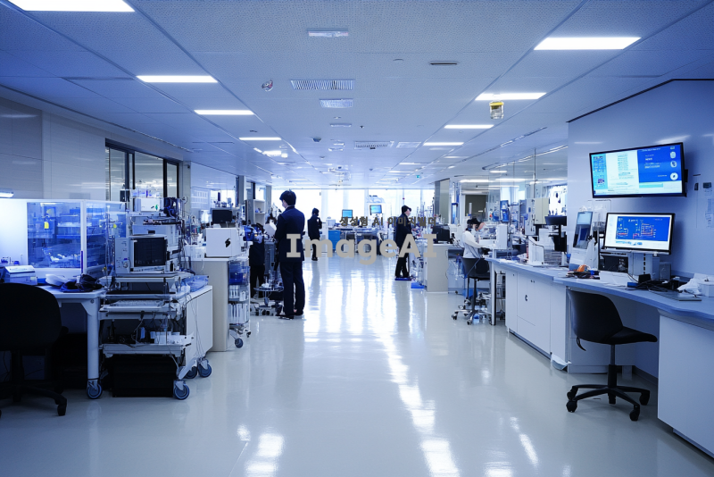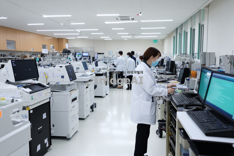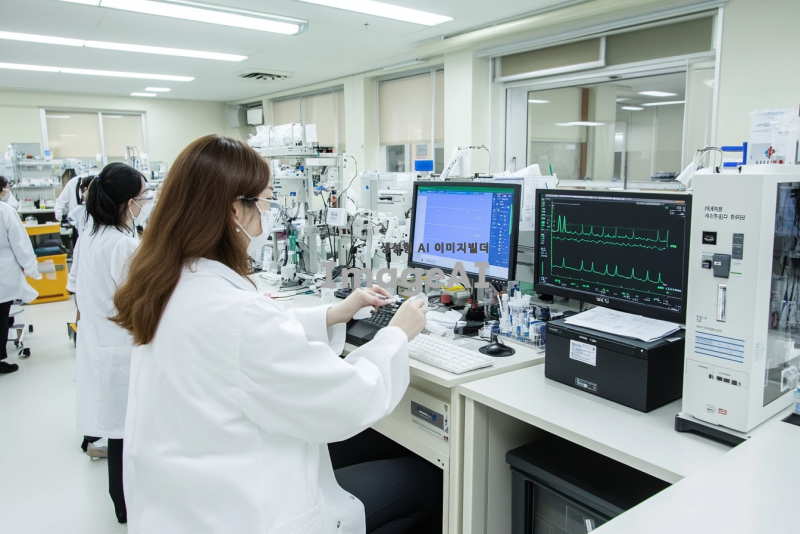 한국의 현대 의료 환경을 배경으로 한 의료 과학 연구실, 실험 장비와 샘플이 가득한 공간, 연구원들이 실험을 진행하고 있는 모습, 다양한 의료 기기와 컴퓨터 화면에 데이터 분석 결과가 표시되어 있는 장면, 깨끗하고 정돈된 환경, 밝은 조명 아래에서 집중하는 연구자들의 모습, 생명과학의 발전을 상징하는 이미지.