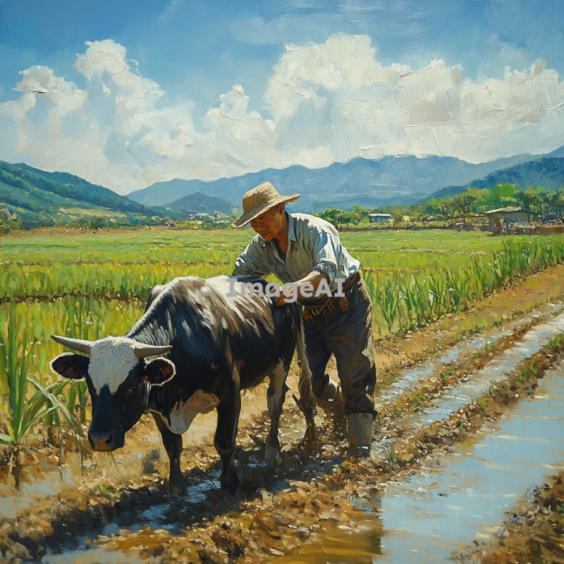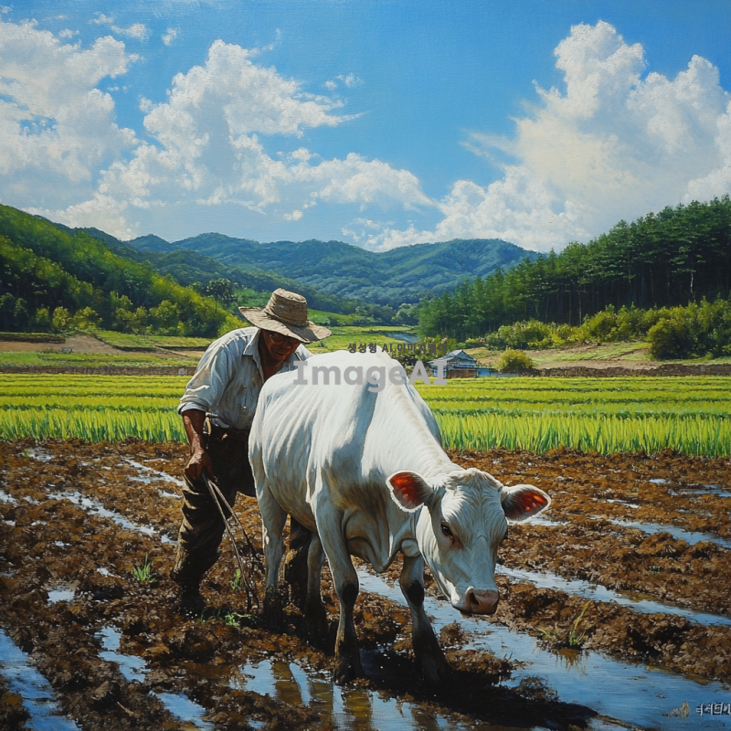 땀을 흘리며 힘들게 일하는 한국의 소, 농촌 배경, 푸른 들판과 하늘, 햇빛 아래에서 땀방울이 맺혀 있는 모습, 소의 근육이 강조된 모습, 자연의 생동감이 느껴지는 장면