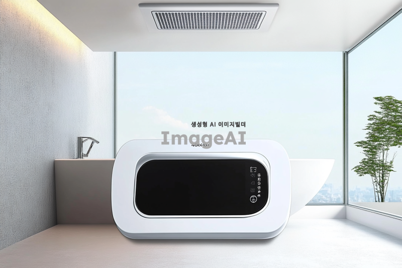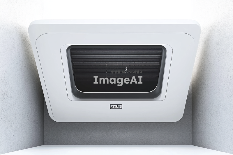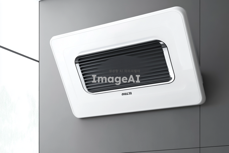 천정형 욕실용 환기팬 제품 디자인, 치수는 477mm*314mm*260mm, 전동댐퍼가 장착되어 있으며 환기와 온풍 기능을 갖추고 있는 모습, 제습 및 건조 기능이 강조된 디자인, 현대적이고 세련된 느낌의 외관, 실용성과 기능성을 강조한 디테일, 배경 없이 제품만 부각된 형태로 표현.