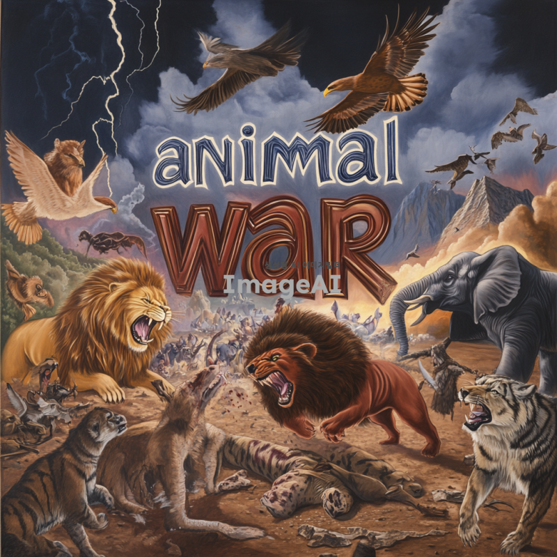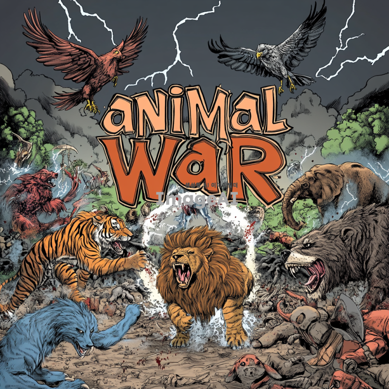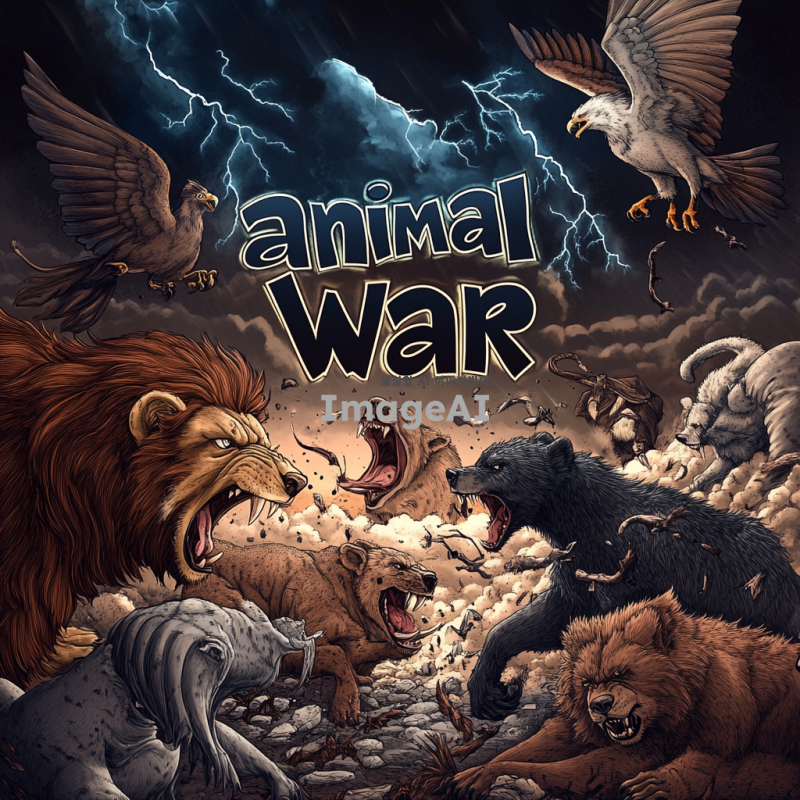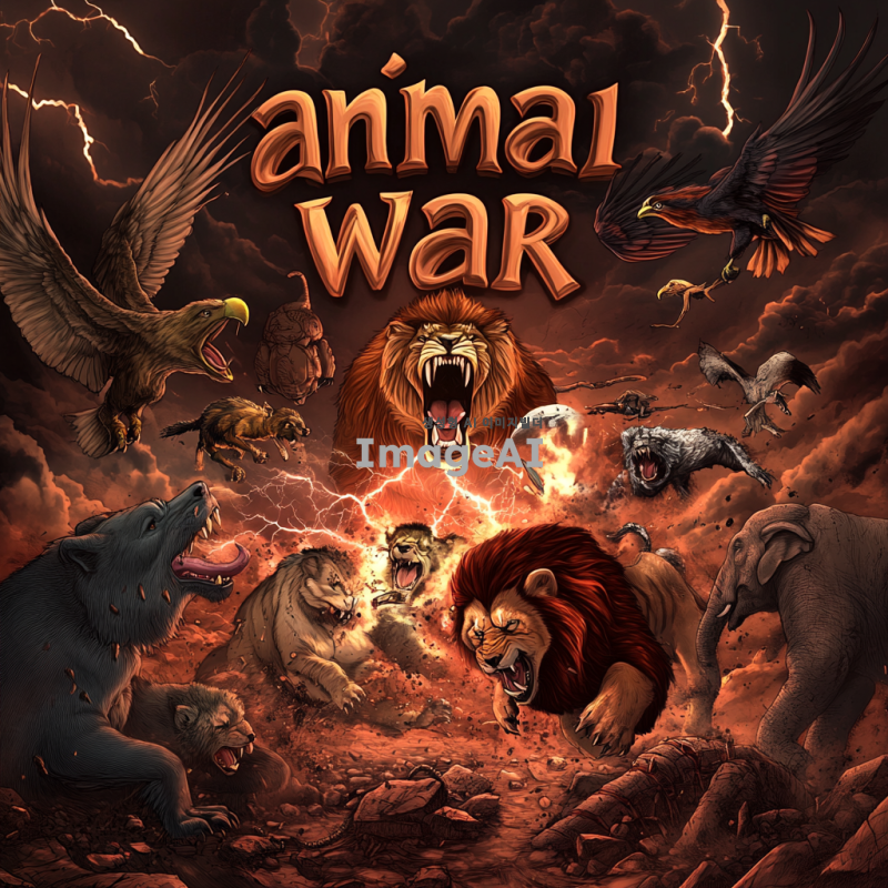 중앙에 "animal war"라는 큰 글씨가 적혀 있고, 그 주위에서 다양한 동물들이 격렬하게 싸우고 있는 장면을 그려주세요. 동물들은 사자, 호랑이, 곰, 코끼리, 독수리, 늑대 등 다양한 종류로 구성되어 있으며, 각 동물의 특징이 잘 드러나도록 표현해 주세요. 배경은 전투의 긴장감을 더하기 위해 어두운 구름과 번개가 치는 하늘로 설정하고, 땅은 흙과 돌이 흩어져 있는 전투의 현장으로 묘사해 주세요.