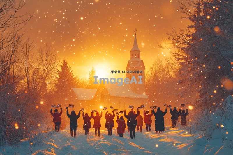 겨울 수련회 분위기의 교회 찬양 플레이리스트 썸네일, 따뜻한 색감의 배경, 눈 내리는 풍경과 함께 교회 건물의 실루엣, 찬양하는 사람들의 모습, 성경 구절이 적힌 손팻말, 아늑하고 영적인 느낌, 한국인 모습의 청소년들이 함께 모여 즐거운 표정으로 찬양하는 장면, 겨울의 따뜻함과 신앙의 기쁨을 전달하는 이미지