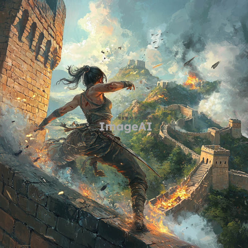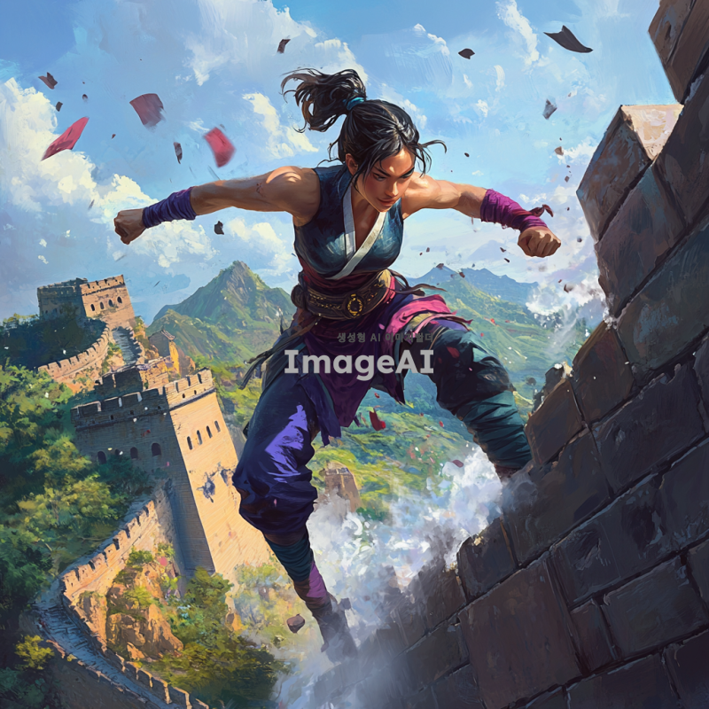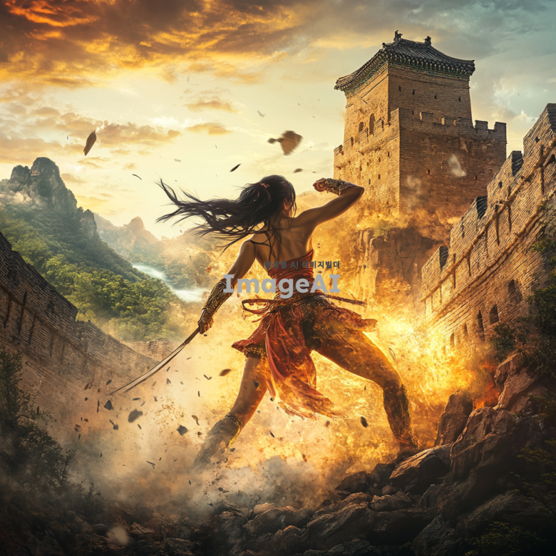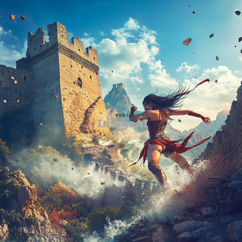 거대한 여성이 만리장성을 힘으로 부수는 장면, 힘찬 표정과 역동적인 포즈, 주변의 고대 건축물과 자연경관이 어우러진 배경, 강렬한 색감과 생동감 넘치는 분위기, 한국적인 요소가 포함된 스타일.