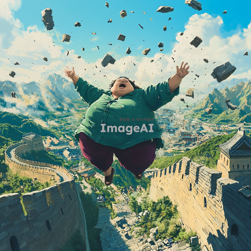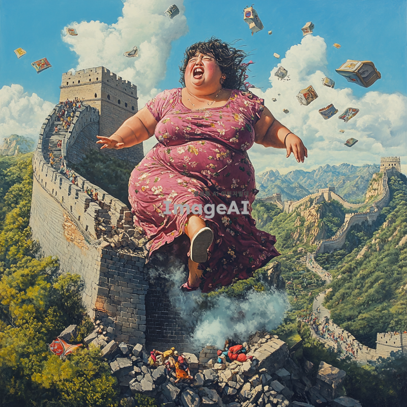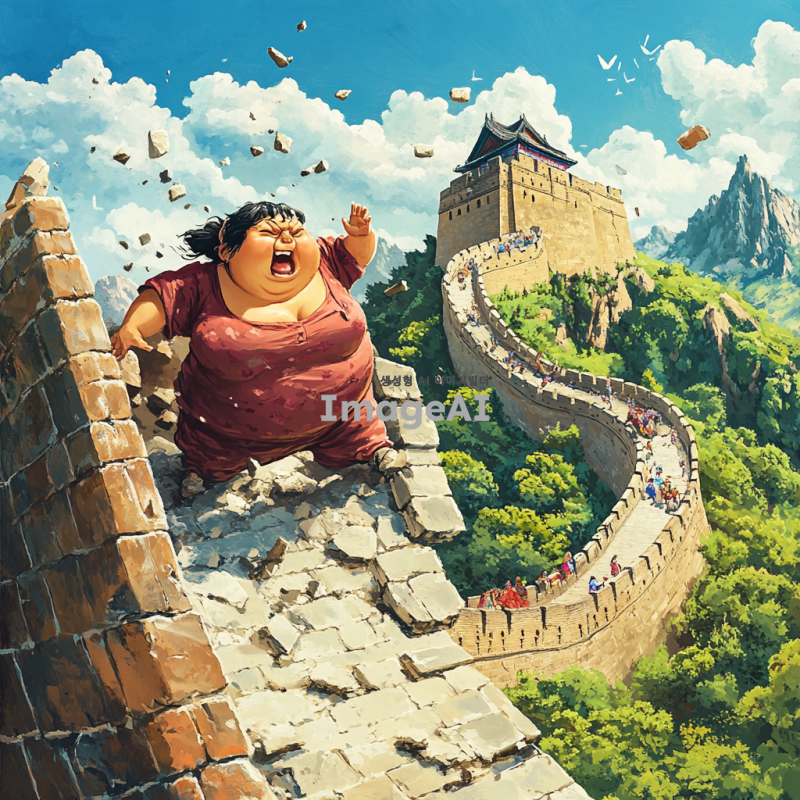 뚱뚱한 한국 여성이 중국의 만리장성을 몸통박치기로 부수는 장면, 힘찬 모습과 함께 만리장성이 무너지는 순간, 주변의 경치와 함께 생동감 있게 표현, 유머러스한 분위기.
