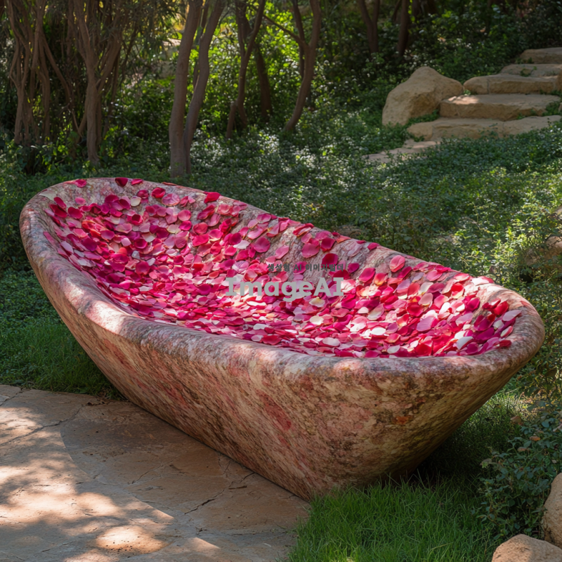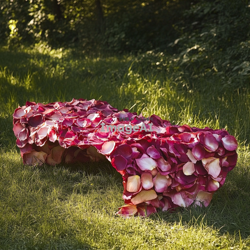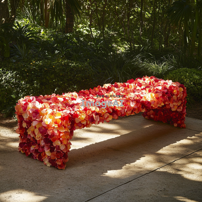 장미꽃잎으로 아름답게 디자인된 아트벤치, 섬세한 꽃잎의 질감과 색상이 조화롭게 어우러진 모습, 자연 속에 배치된 벤치, 따뜻한 햇살 아래에서 편안하게 쉴 수 있는 공간, 세련된 현대적인 스타일과 자연의 아름다움이 조화를 이루는 장면.
