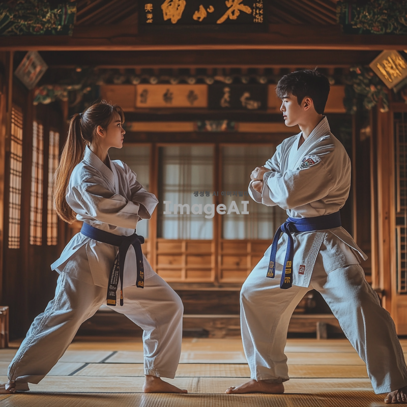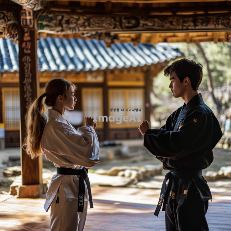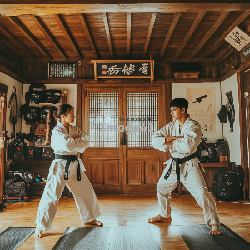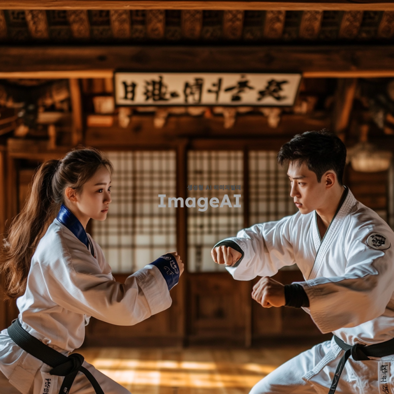 한국의 전통 격투기 도장에서 훈련 중인 젊은 남성과 여성, 서로 대결 자세를 취하고 있는 모습. 배경에는 전통적인 한옥이 보이고, 바닥에는 매트가 깔려 있으며, 주변에는 격투기 도구들이 놓여 있다. 두 사람은 집중한 표정으로 상대를 바라보며, 힘찬 자세를 취하고 있다. 태극기와 한복을 연상시키는 색상의 복장을 입고 있으며, 격투기의 역동적인 순간을 포착한 장면.