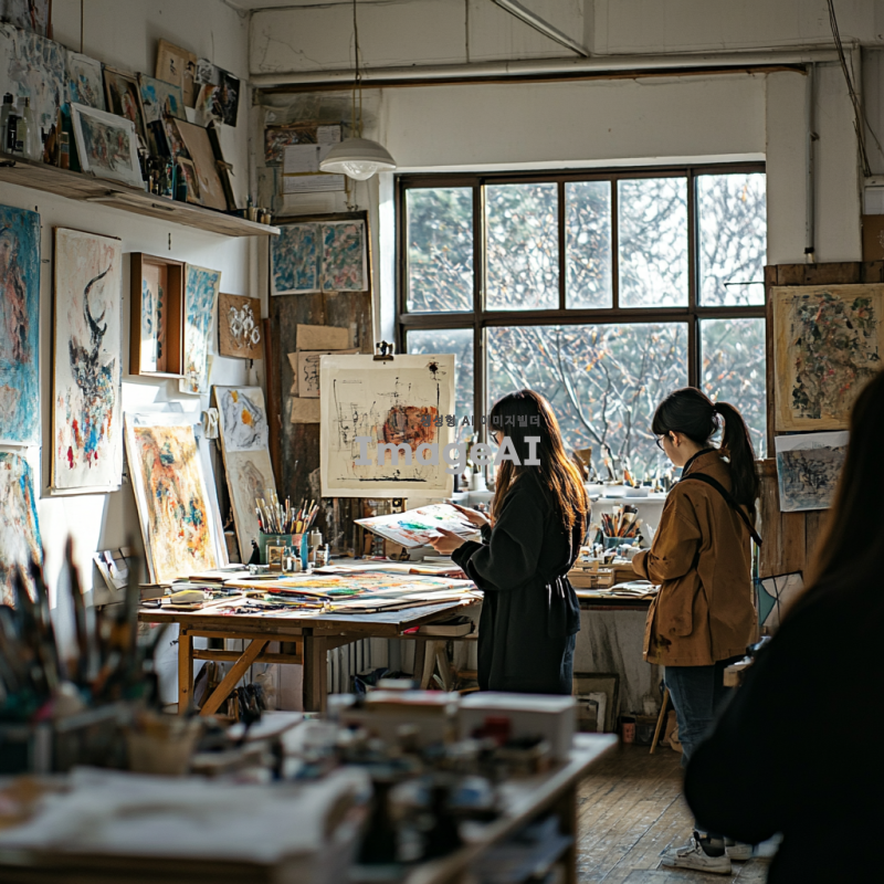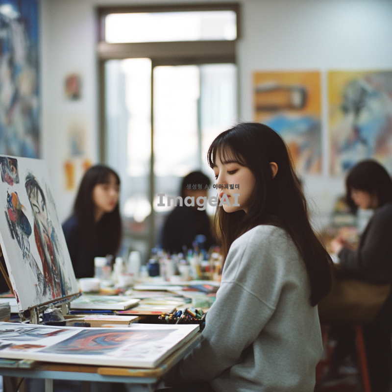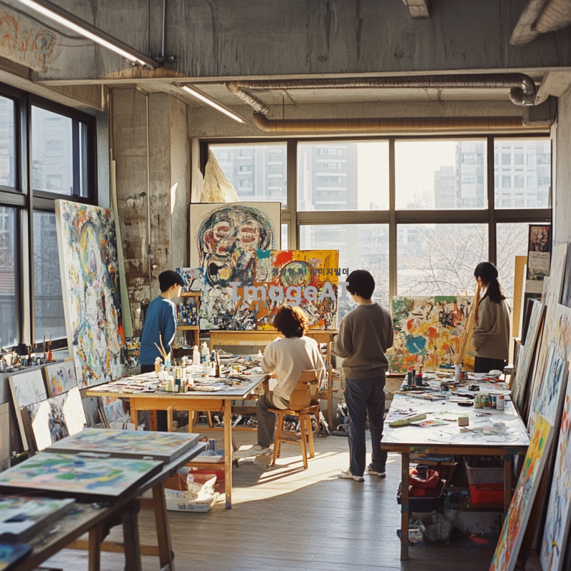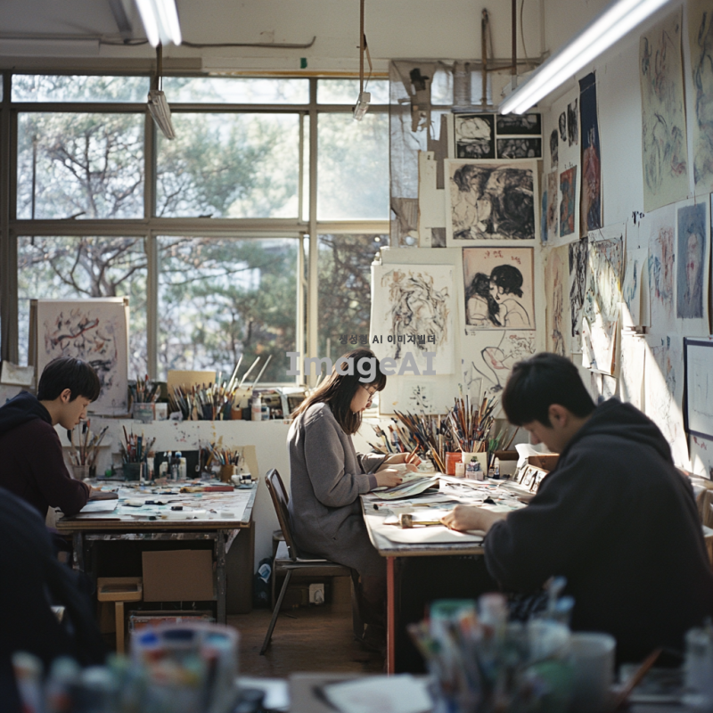한국의 미술학원에서 초중고 입시미술을 준비하는 학생들이 열심히 작업하는 모습, 다양한 미술 도구와 재료가 놓인 작업실, 학생들이 그림을 그리고 있는 장면, 창의력과 집중력이 느껴지는 분위기, 따뜻한 자연광이 들어오는 창가, 미술 작품들로 가득한 벽, 서로 의견을 나누며 협력하는 모습, 진지한 표정의 학생들, 다양한 연령대의 한국인 학생들, 아트 스튜디오의 생동감 넘치는 환경.