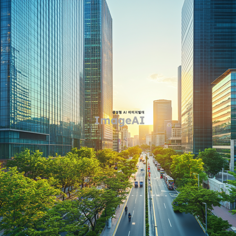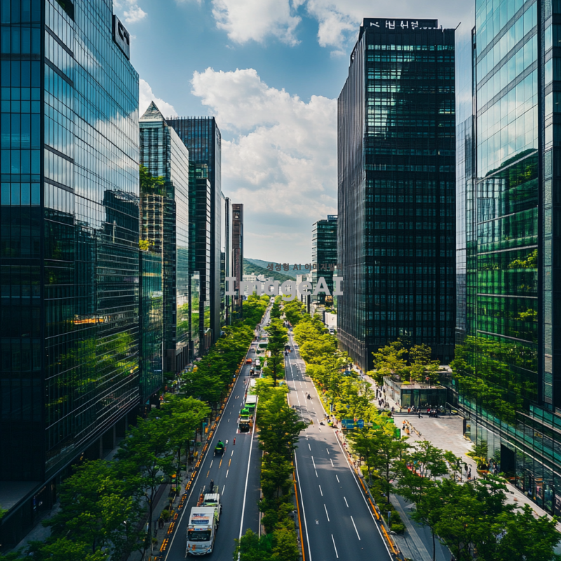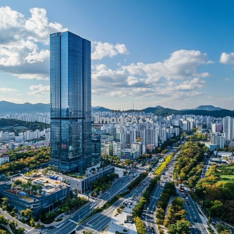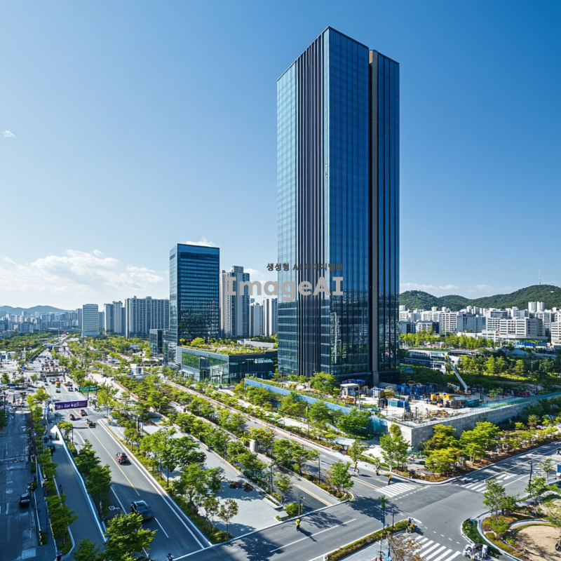 고층 빌딩의 외관, 현대적인 디자인과 깨끗한 환경, 건물 관리와 안전을 상징하는 경비원과 소독 작업을 하는 모습, 주변에 푸른 나무와 깨끗한 도로가 있는 도시 풍경, 한국의 도심 지역을 배경으로 한 이미지.
