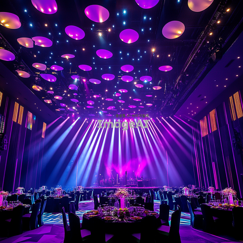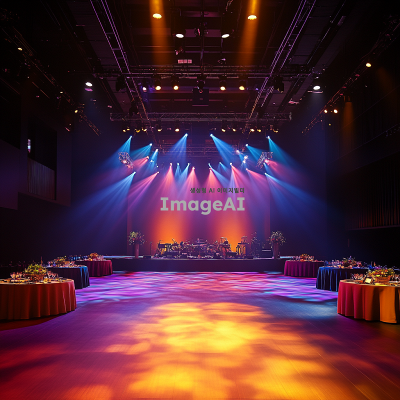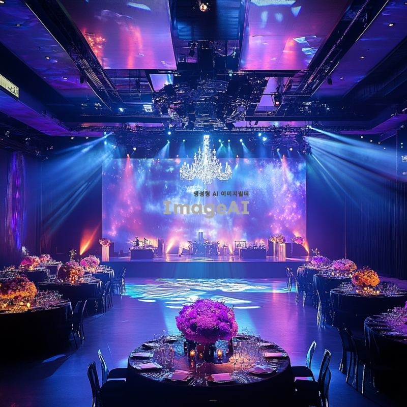 한국의 현대적인 행사 현장, 화려한 조명이 설치된 무대, 다양한 장식과 배경이 어우러진 모습, 관객들이 즐겁게 참여하는 분위기, 생동감 넘치는 색감과 조명 효과, 세련된 디자인의 무대 구성, 감동적인 순간을 포착한 장면