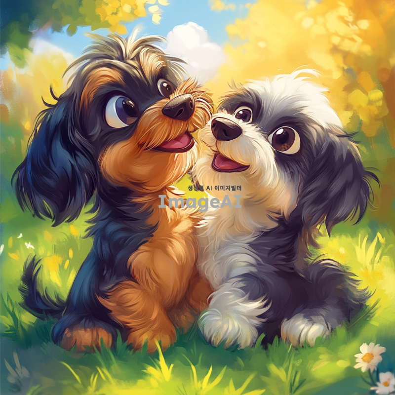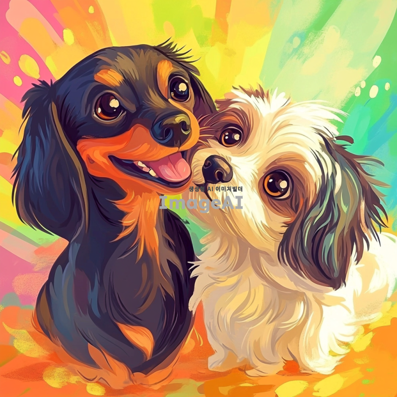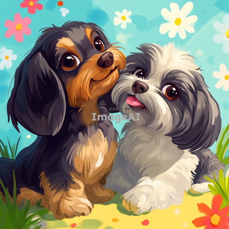 장난치는 단모닥스훈트와 시츄가 함께 놀고 있는 모습, 밝고 화사한 배경, 귀여운 표정으로 서로 장난치는 모습, 푹신한 털과 큰 눈, 아기자기한 느낌의 일러스트 스타일.