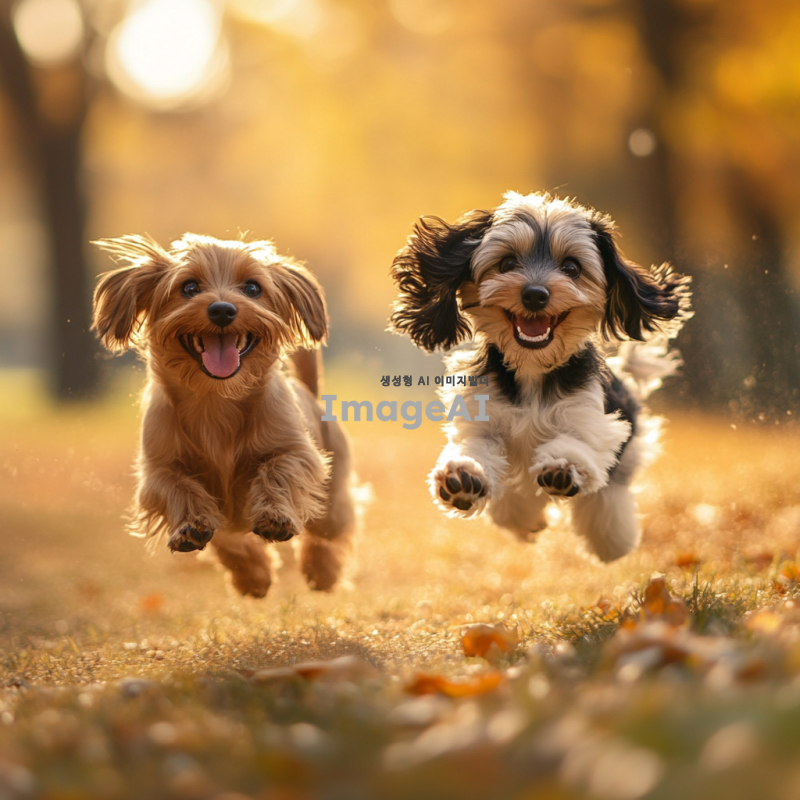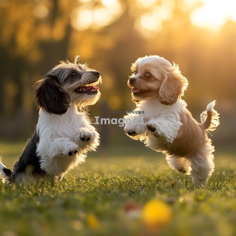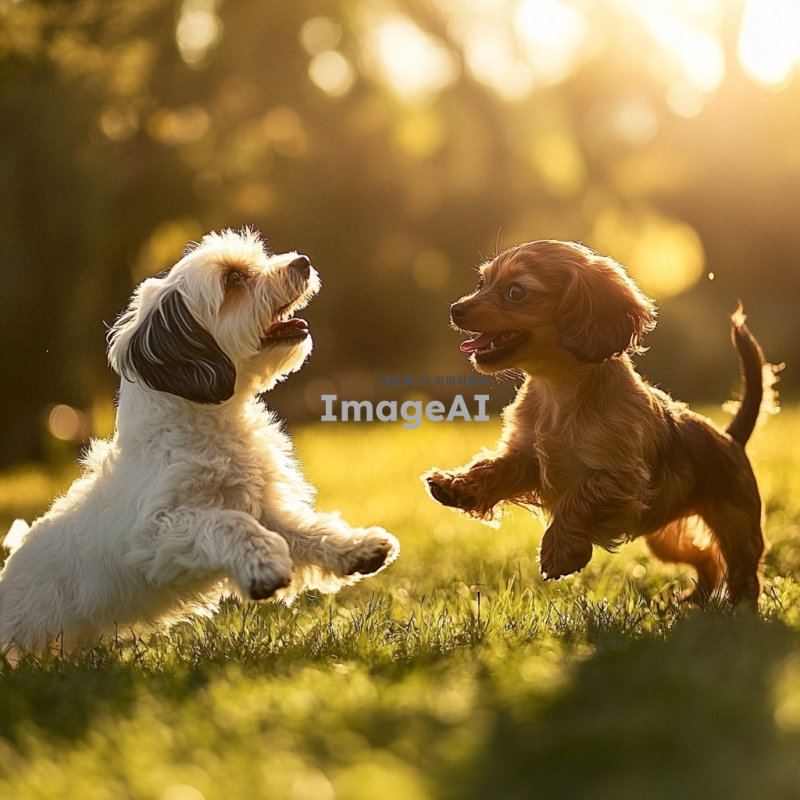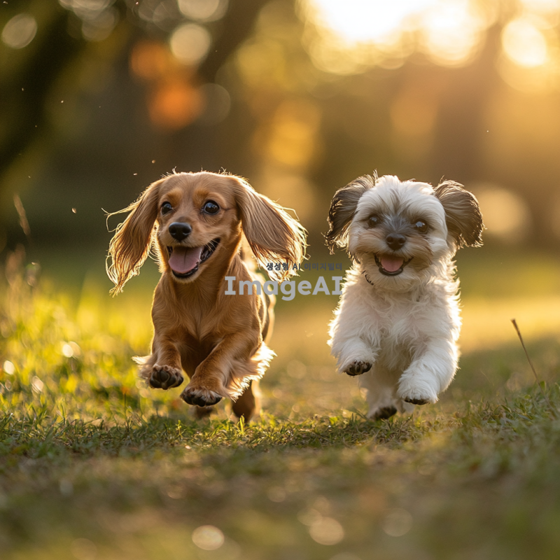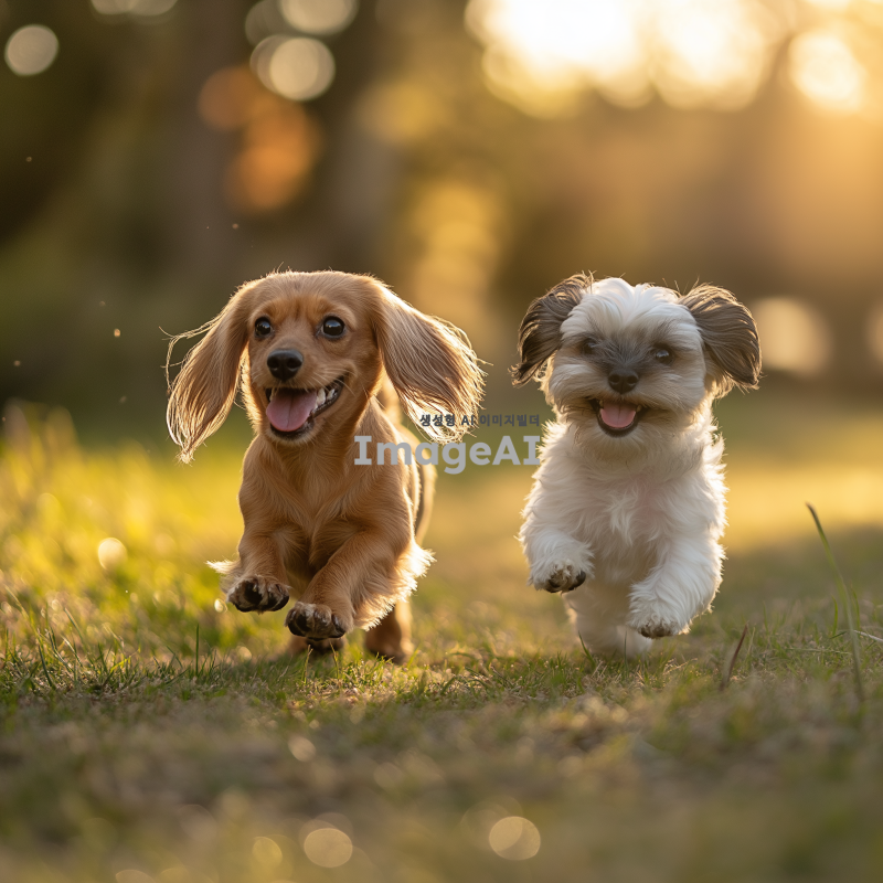 짧은 털을 가진 닥스훈트와 시츄가 함께 놀고 있는 모습, 밝고 화사한 배경 속에서 두 강아지가 서로 뛰어다니며 장난치는 모습, 귀여운 표정과 활기찬 자세, 따뜻한 햇살이 비추는 공원 풍경.