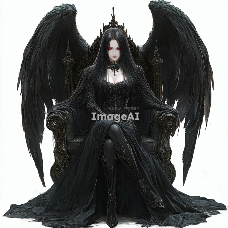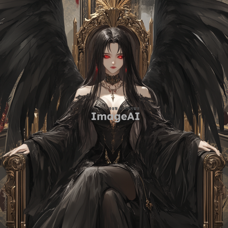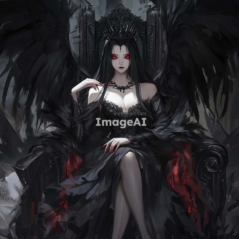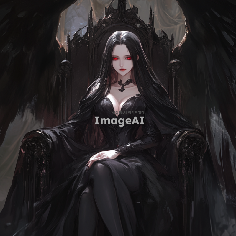 긴 검은 생머리와 빨간 눈동자, 하얀 피부를 가지고 있고 소매가 팔보다 길고 길이가 2m가 넘고 길고 검은 망토가 달린 검은 예복를 입고있고 크고 화려한 검은색 왕관에 크고 웅장한 검은색 왕좌에 앉아있고 세상을 지배하고 검고 큰 날개가 달려있고 어둠의 마법을 쓰는 어둠의 여신