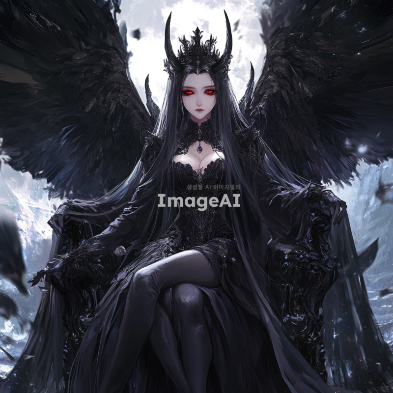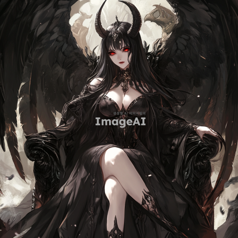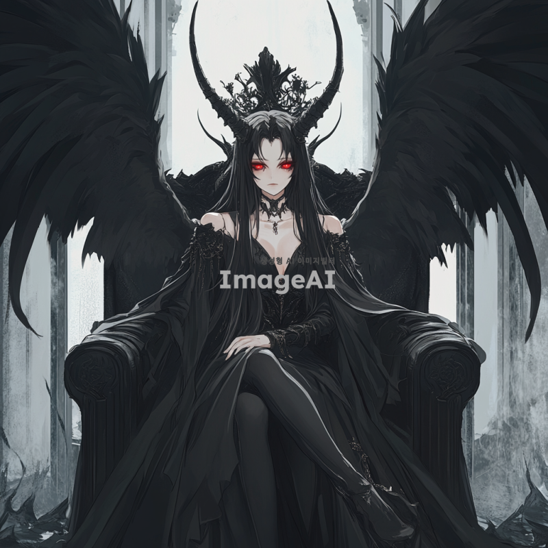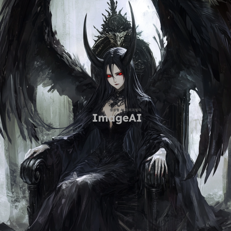 긴 검은 생머리와 빨간 눈동자, 하얀 피부를 가지고 있고 길고 검은 망토가 달린 긴 검은 예복를 입고있고 크고 화려한 검은색 왕관에 크고 웅장한 검은색 왕좌에 앉아있고 세상을 지배하고 검고 큰 날개가 달려있고 어둠의 마법을 쓰고 큰 뿔이 달린 어둠의 여신