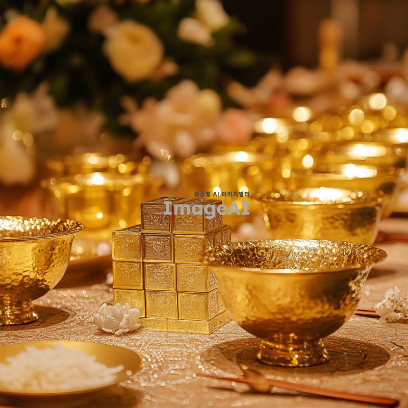 식탁 위에 놓인 여러 개의 황금 밥공기들, 그 사이에 네모난 금덩어리들이 쌓여 있는 모습. 따뜻한 조명 아래 반짝이는 금빛과 고급스러운 식탁 세팅, 아늑하고 풍성한 분위기를 연출.