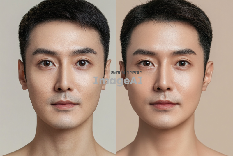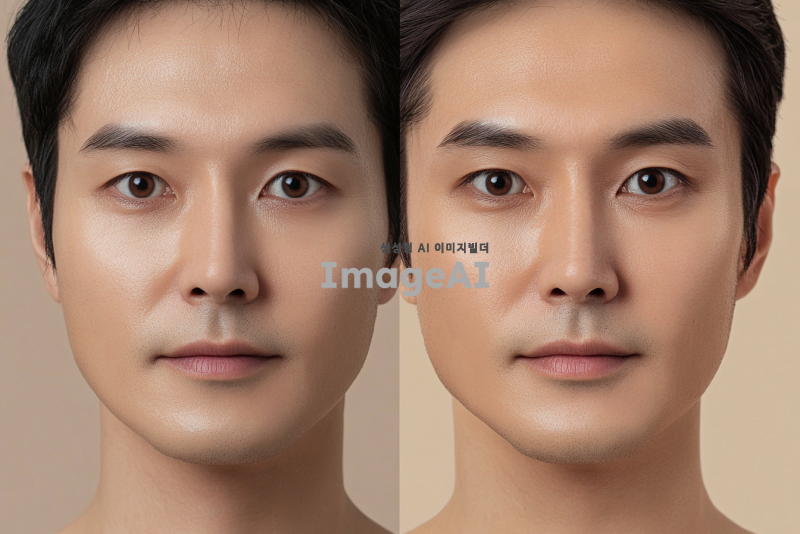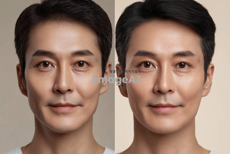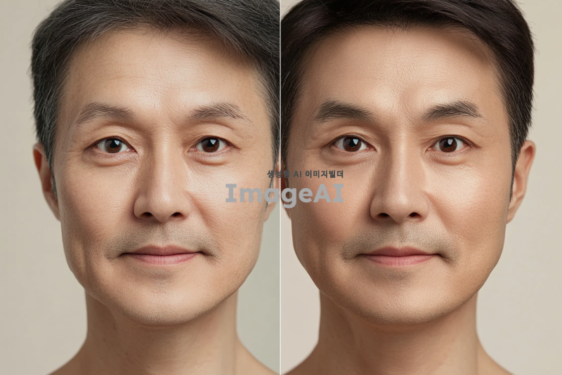 노화 관련 영양제를 먹기 전과 후의 얼굴을 비교하는 이미지. 왼쪽에는 영양제를 먹기 전의 한국인 남성의 얼굴, 피부가 약간 칙칙하고 주름이 보이는 모습. 오른쪽에는 영양제를 먹고 난 후의 같은 남성의 얼굴, 피부가 밝고 탄력 있으며 주름이 줄어든 모습. 두 얼굴이 나란히 배치되어 변화의 차이를 강조하는 구도. 배경은 자연스럽고 부드러운 색감으로 설정.