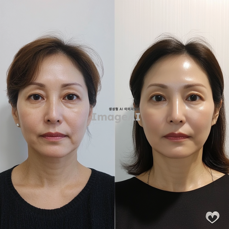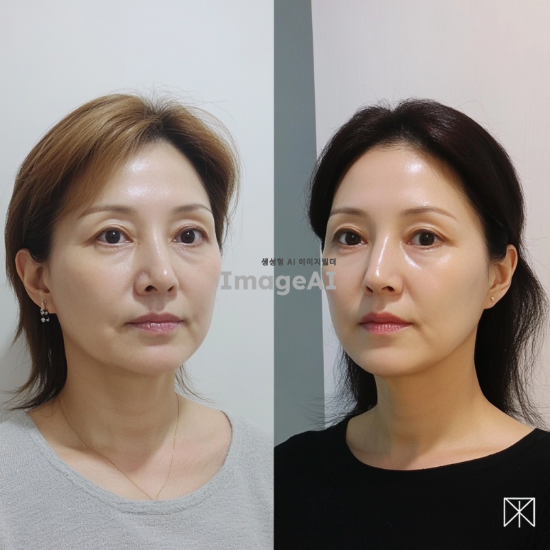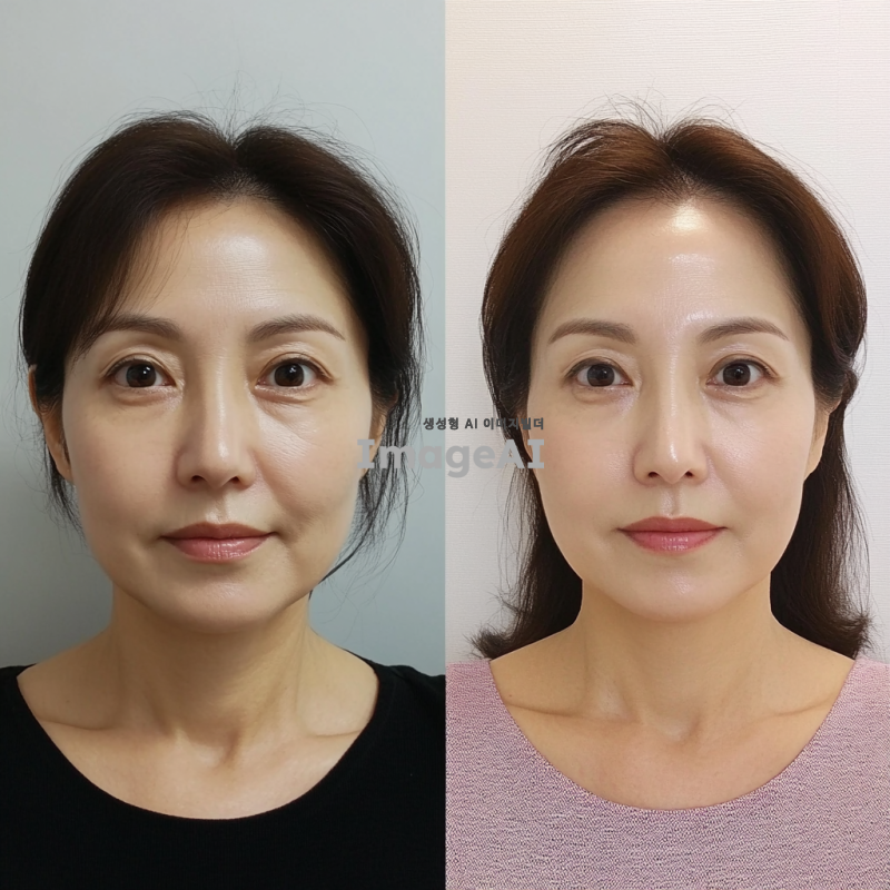 한국인 중년 여성이 얼굴 피부 관리를 받기 전과 후의 모습을 나란히 비교하는 사진. 왼쪽에는 피부 관리 전의 자연스러운 모습, 오른쪽에는 피부 관리 후의 밝고 매끄러운 피부를 강조한 모습. 밝은 조명 아래에서 피부의 변화를 잘 드러내며, 편안한 실내 환경에서 촬영된 느낌.