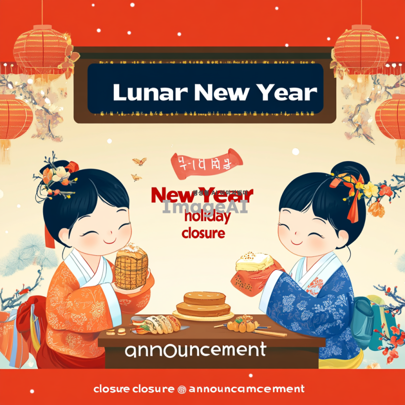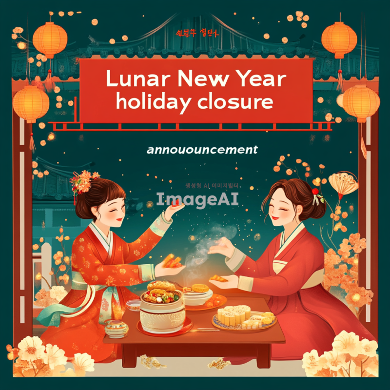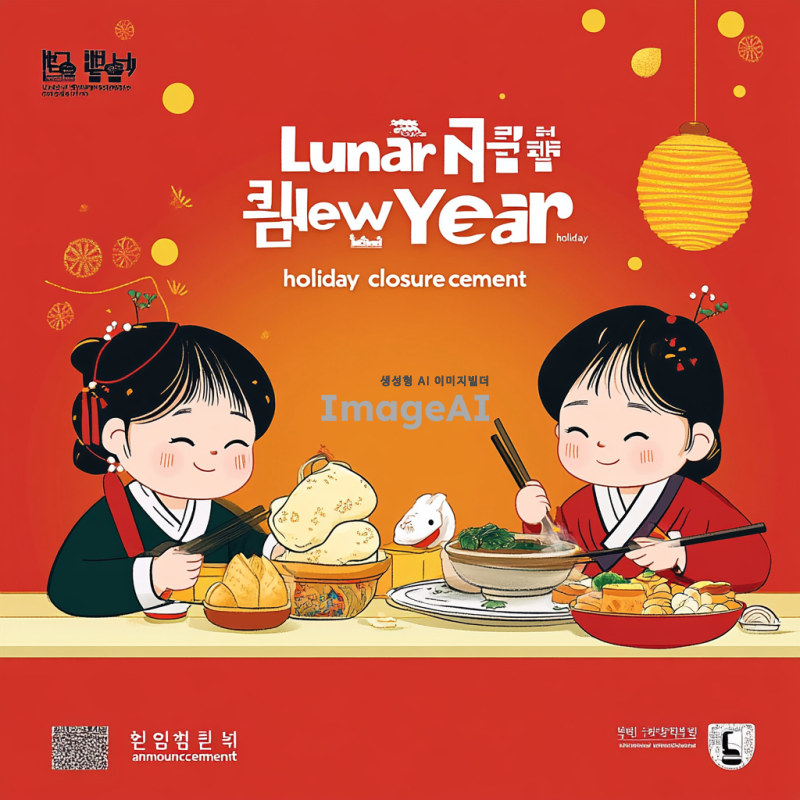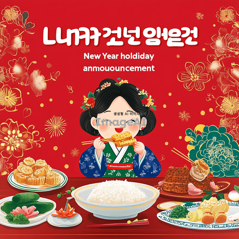 설날 명절 휴관 안내 포스터 디자인, 2025년 1월 27일부터 1월 30일까지 휴관임을 알리는 내용, 전통적인 설날 요소들(복주머니, 떡국, 한복 등)을 포함, 따뜻하고 화사한 색감 사용, 한국적인 느낌을 강조한 스타일, 명절 분위기를 잘 표현한 배경 디자인, 한글로 "설날 명절 휴관 안내"라는 제목 포함, 시각적으로 눈에 띄고 이해하기 쉽게 구성.