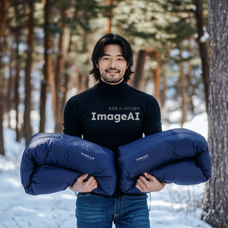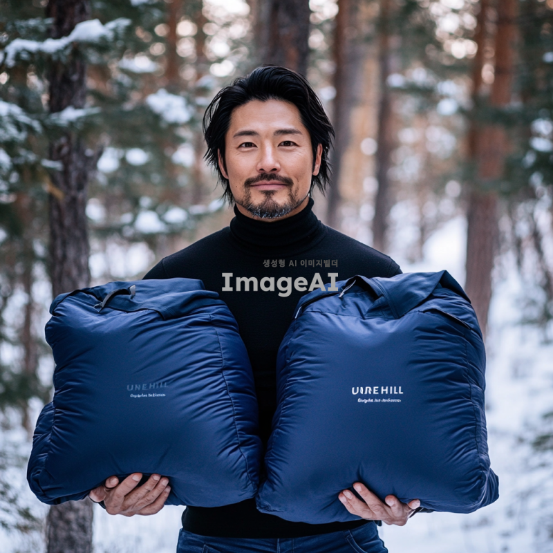 30대의 한국인 남성으로, 짧고 잘 다듬어진 수염과 어깨를 넘는 긴 검은 머리를 가진 rugged한 모습. 검은 터틀넥과 파란 청바지를 입고 있으며, 고요한 겨울 숲 속에 서 있습니다. 눈으로 덮인 높은 나무들이 주변에 있으며, 바닥에는 부드러운 눈이 깔려 있습니다. 남성은 가슴 높이에서 'UNDER HILL' 로고가 크게 인쇄된 두 개의 네이비 블루색 침낭을 들고 있습니다. 침낭은 그의 손바닥으로 받쳐져 있으며, 자연스러운 미소를 지으며 자신감 있고 친근한 분위기를 풍깁니다. 그의 눈은 자연스럽고 표현력이 풍부하며, 한국인으로서의 얼굴 특징이 잘 드러나 있습니다.