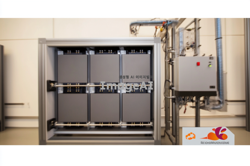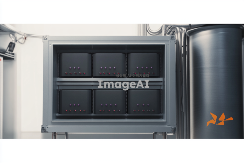 밀폐된 부스 내부가 잘 보이는 장면, 부스 안에는 3단 선반이 4~5개 있으며 각 선반 위에는 배터리 셀들이 2센치미터 간격으로 세로로 가득 꽂혀 있는 모습. 부스 옆에는 사이클론 집진기, 여과 집진기, 흡착탑이 배관으로 순서대로 연결되어 있는 구조. 전체적으로 산업적인 느낌과 세밀한 디테일이 강조된 이미지.