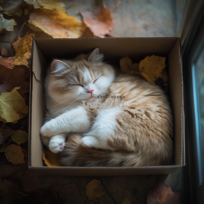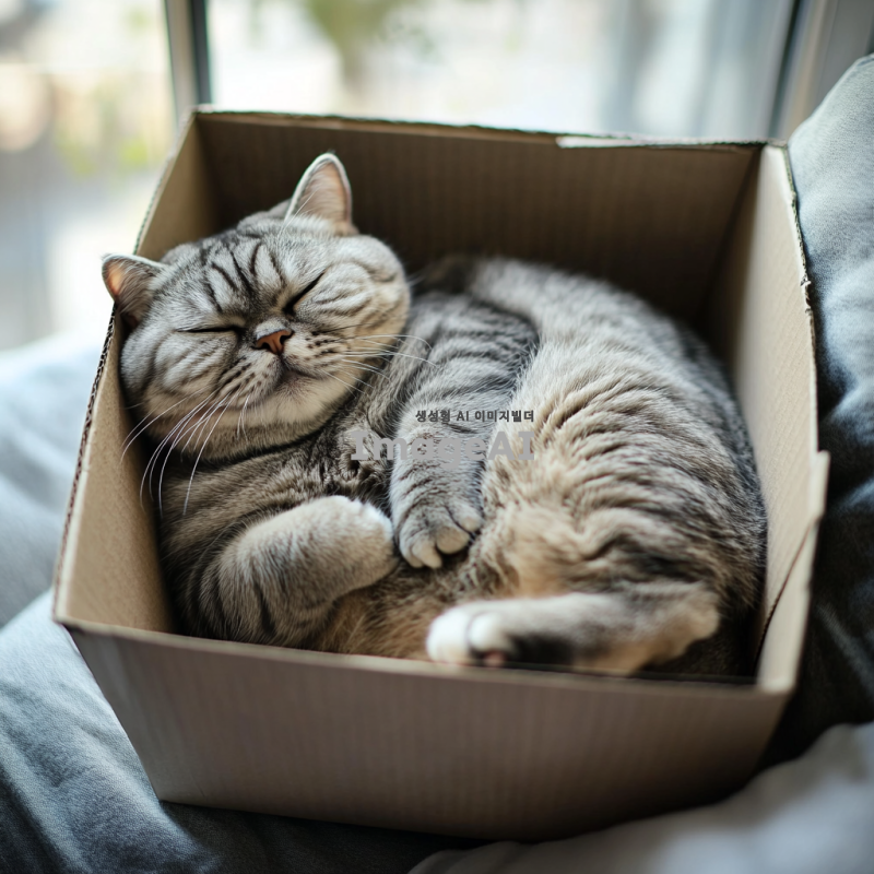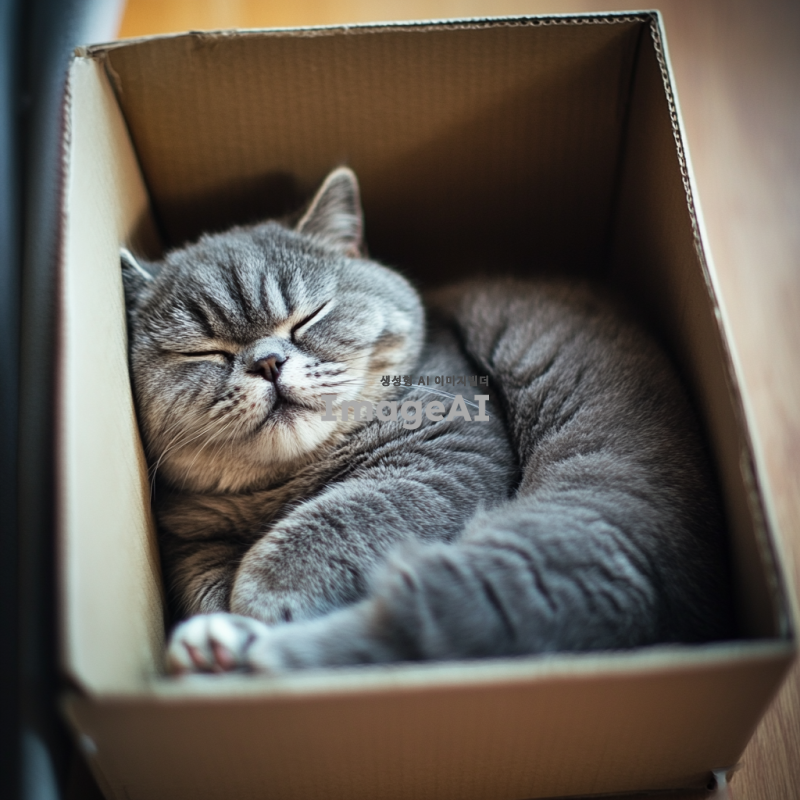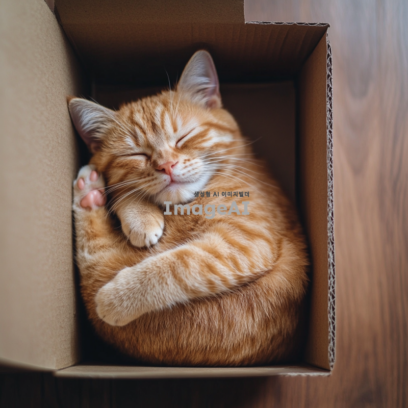 상자에 꽉 맞게 들어가 있는 귀여운 한국 고양이의 이미지, 상자를 위에서 바라본 뷰,고양이는 배를 보인 채로 상자 안에 꽉 들어맞게 꾸겨져서 들어가 누워 있으며 배경은 흐릿하게 처리되어 고양이에 집중할 수 있도록 함.