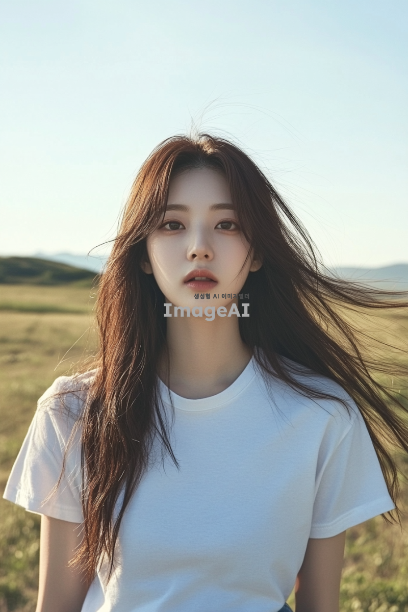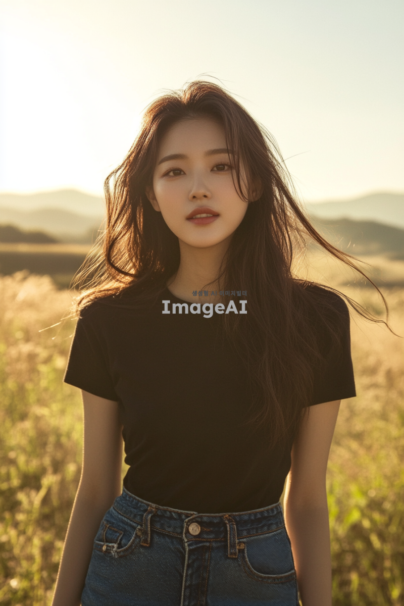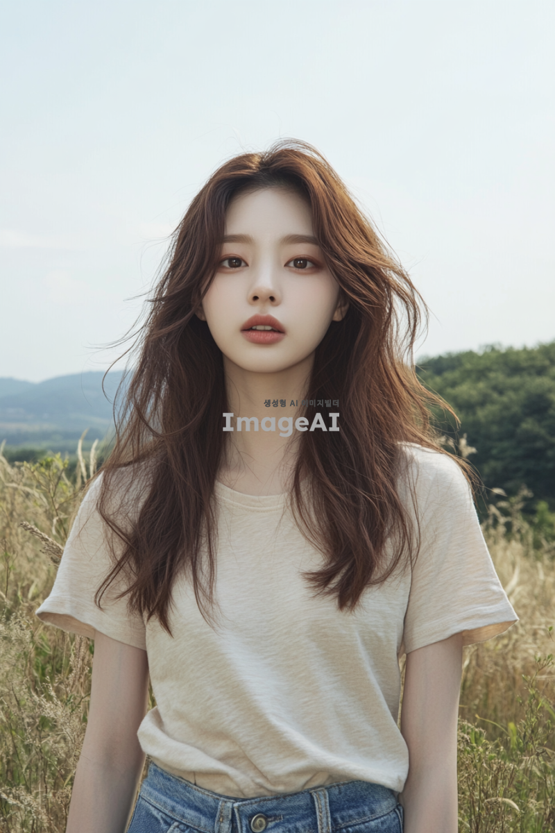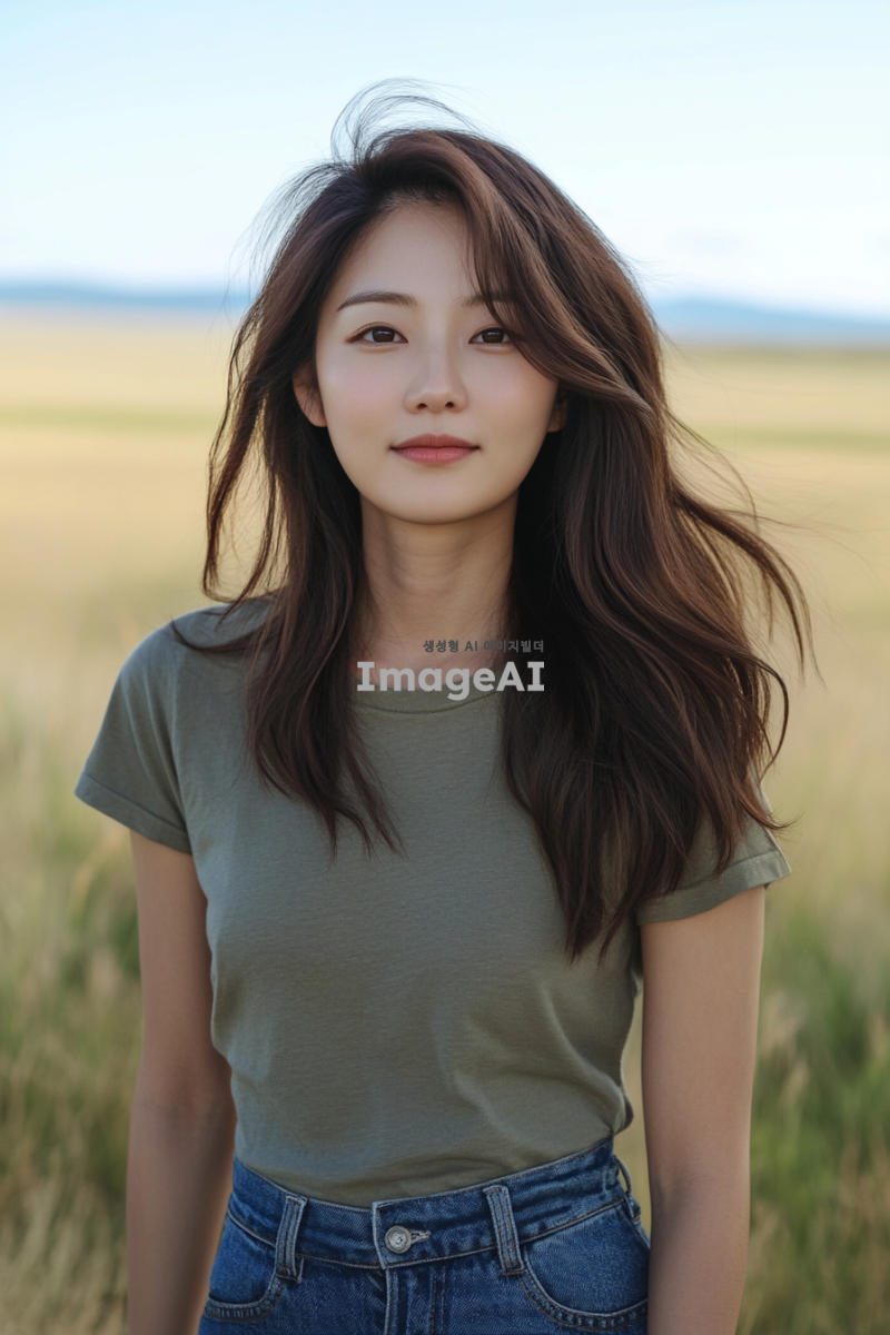 자연스러운 모습의 한국인 여성, 맑은 피부, 긴 머리카락, 편안한 표정, 자연광 아래에서 촬영된 듯한 느낌, 간단한 티셔츠와 청바지 차림, 배경은 부드러운 자연 풍경으로 설정.
