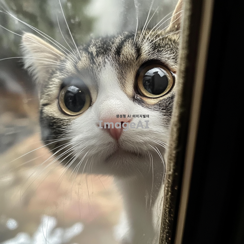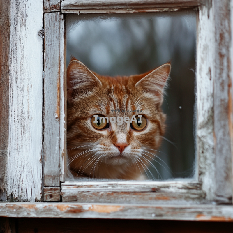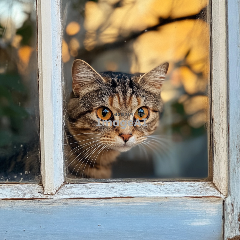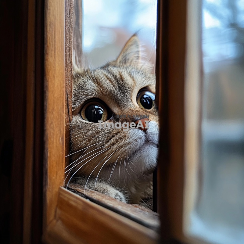 귀여운 고양이가 작은 창을 통해 나를 바라보고 있다. 고양이는 창문에 얼굴을 넣고 쳐다보고 있고, 창문이 너무 작아 고양이 얼굴이 꽉 낀다