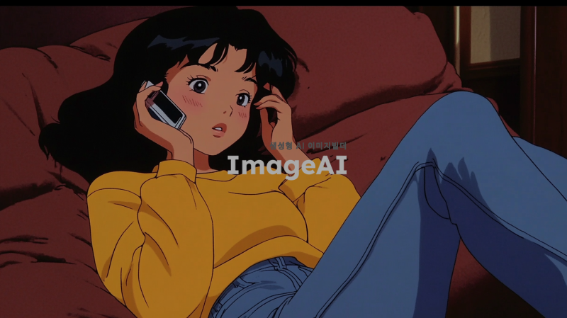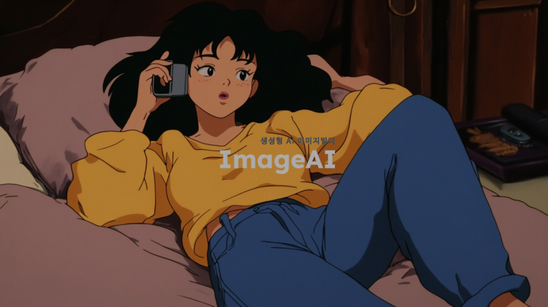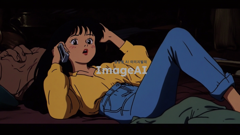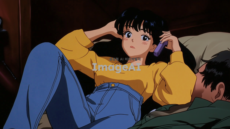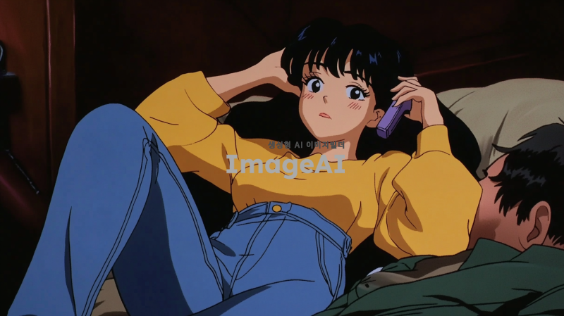 A retro Ghibli 화면 캡처로, 아시아 여성이 등을 대고 누워 전화기를 귀에 대고 있으며, 한쪽 무릎을 구부리고 다른 사람의 머리 옆에 다리를 올리고 있는 모습. 평면적인 시점, 노란색 셔츠, 파란색 바지, 어두운 머리카락, 긴 소매, 90년대 애니메이션 스타일, 단순한 선과 색상, 스튜디오 조명, 클로즈업 샷, 높은 각도에서 촬영, 따뜻한 색조, 순간을 포착한 모습, 레트로.